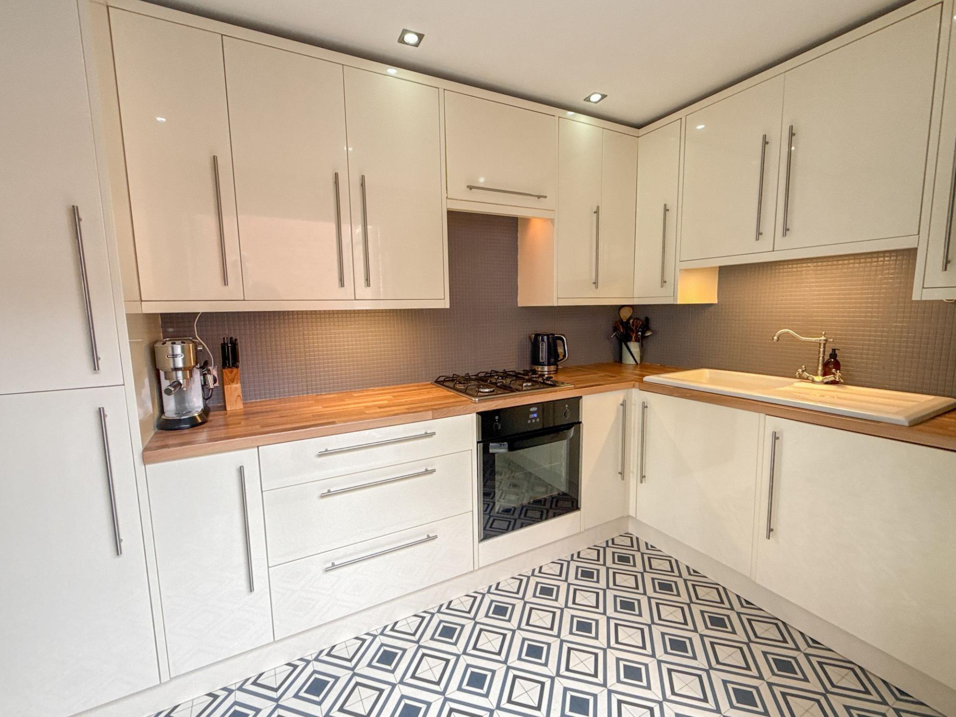 The kitchen, also located to the rear, is fitted with a comprehensive range of modern, stylish units complemented by ample work surfaces and built-in cooking appliances. This space has been thoughtfully designed to combine functionality with aesthetics. From here, patio doors open directly onto the attractive raised decked patio, providing a smooth transition between indoor and outdoor living — ideal for enjoying morning coffee, evening drinks, or summer dining.