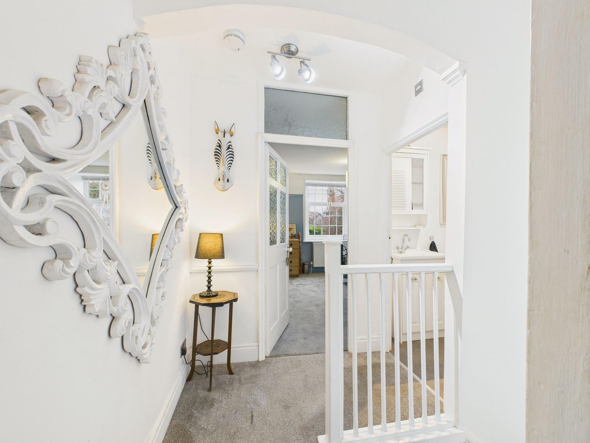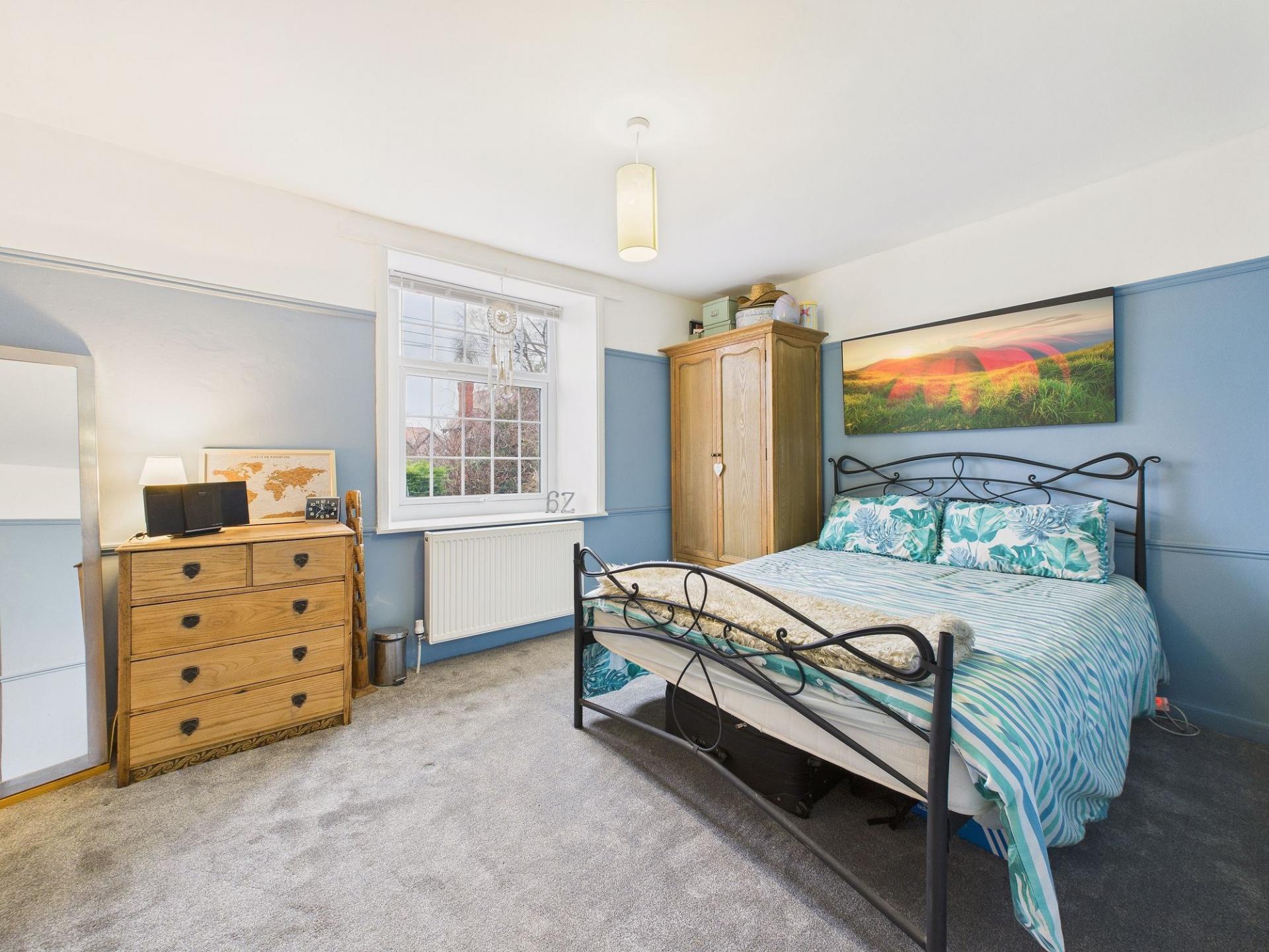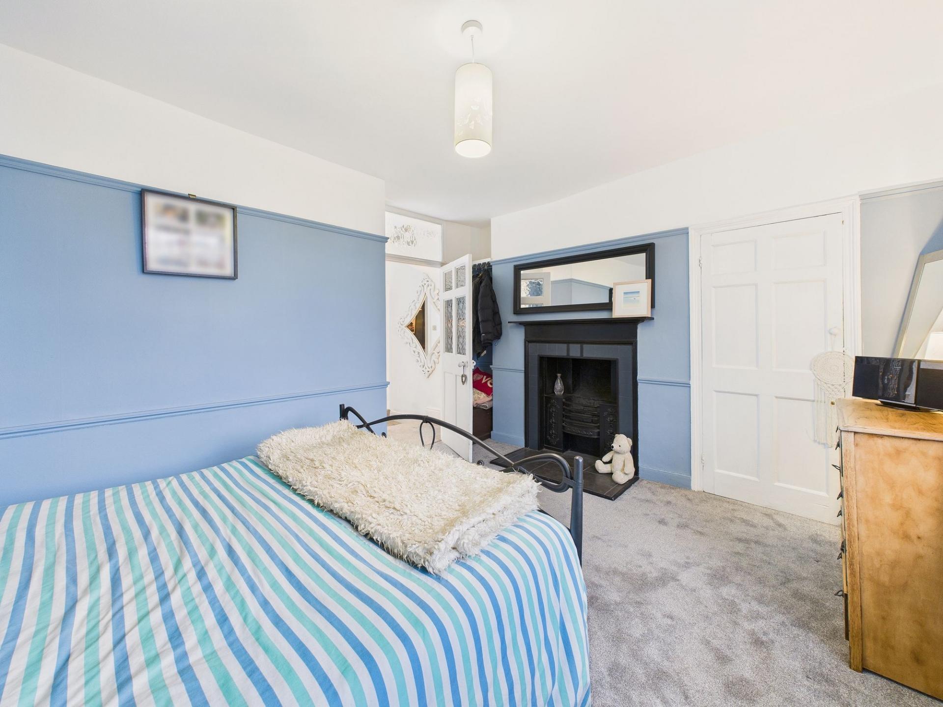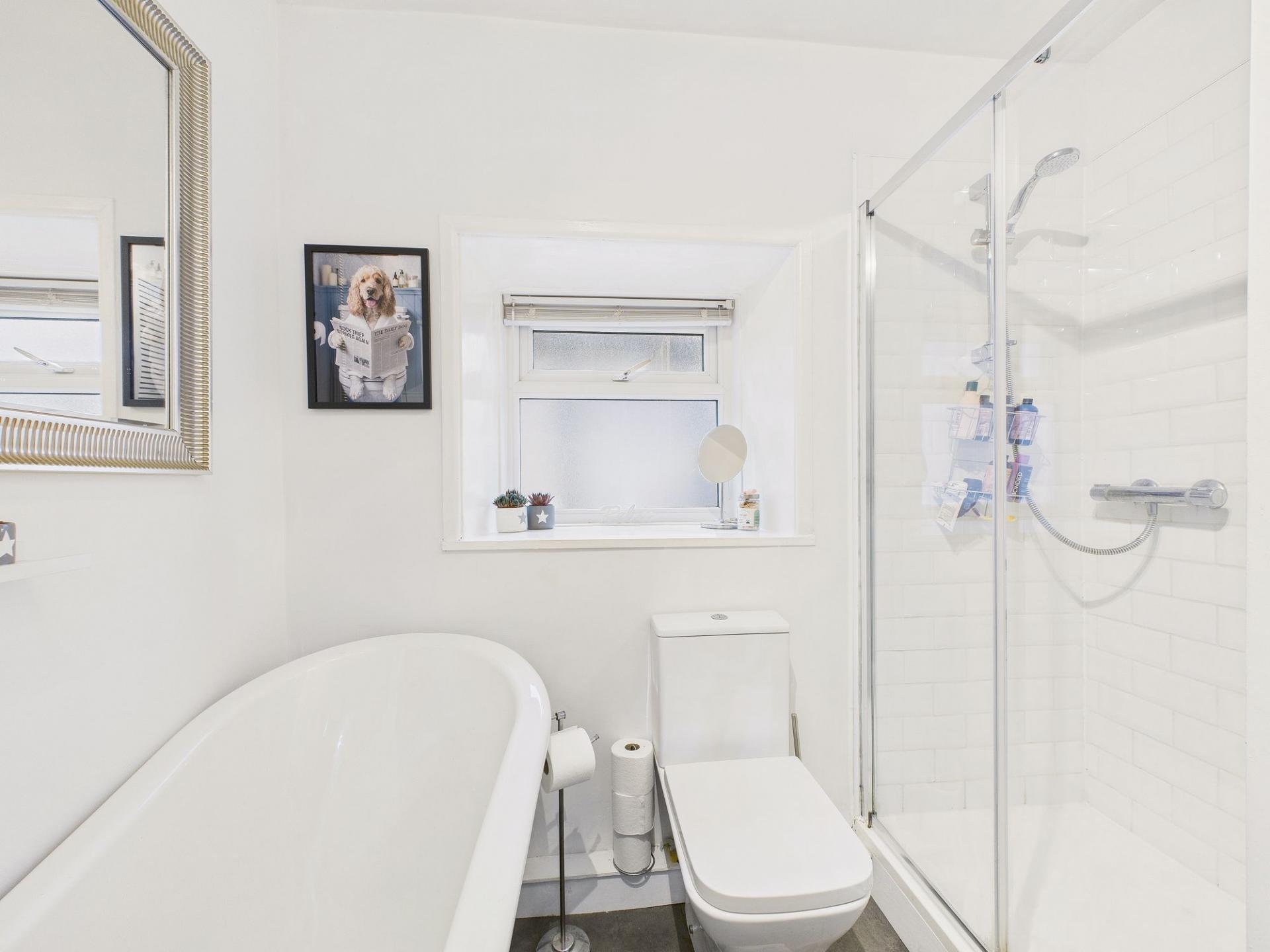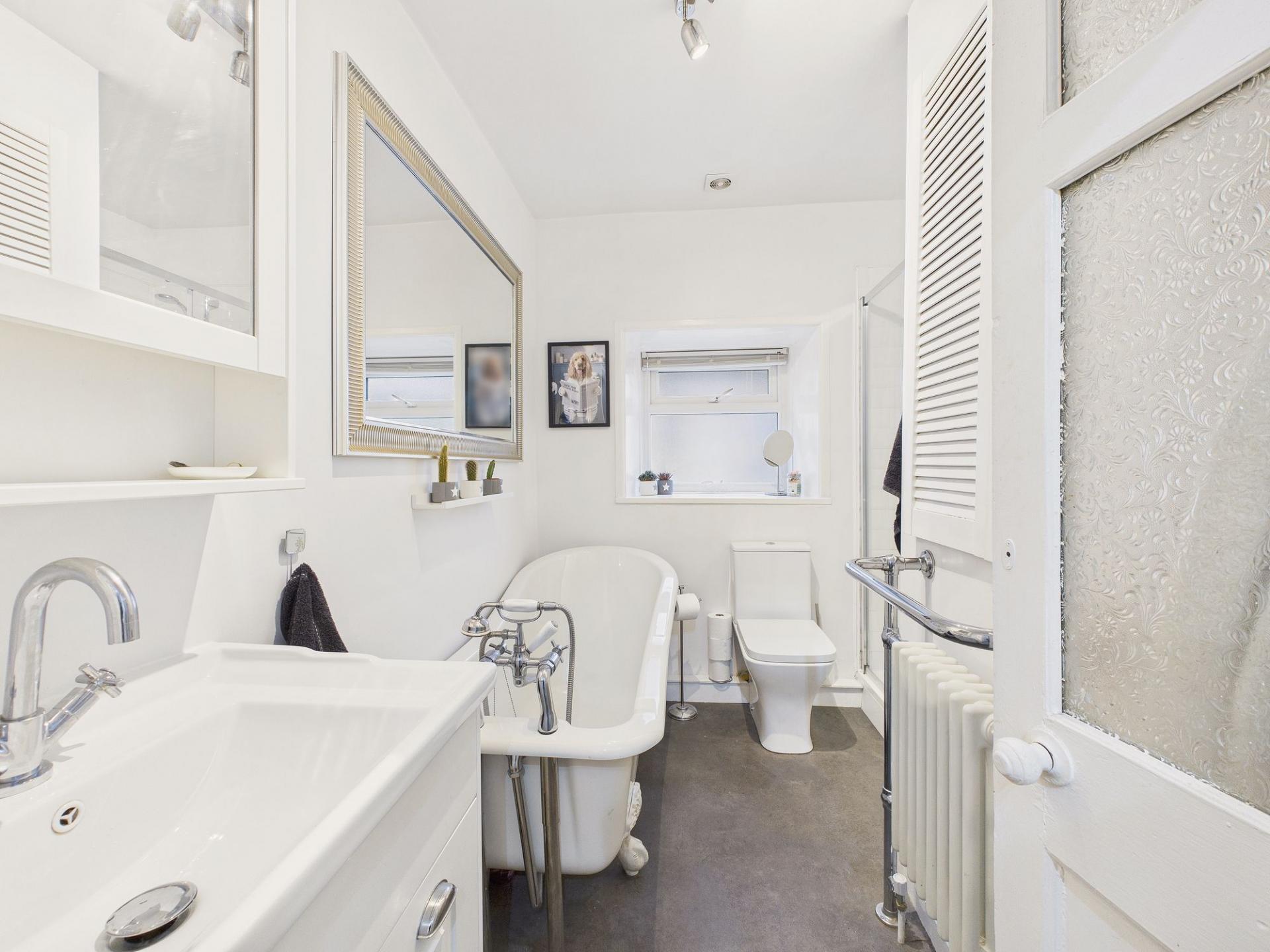 The first floor hosts two generously proportioned double bedrooms, both retaining beautiful decorative traditional fireplaces which enhance the home’s period appeal. These rooms are served by a beautifully appointed bathroom, featuring a roll-top bath, WC, hand wash basin set within a vanity storage unit, and a spacious double shower enclosure with a mains-fed shower, providing both luxury and everyday comfort.