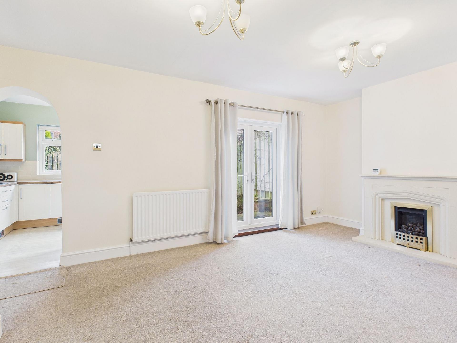 Upon entering the property you are welcomed by an inviting entrance hallway. To the front of the property is a generously sized lounge, enhanced by a charming bay window. A modern fireplace, positioned on the chimney breast, creates an attractive focal point and a warm, comfortable living space. Double doors lead through to the dining room, an ideal area for family meals or entertaining guests, featuring patio doors that open directly onto the rear garden and a further feature fireplace adding character and charm. An open archway connects the dining room to the fitted kitchen, which offers a practical space for everyday cooking. Completing the ground floor is a convenient downstairs WC.