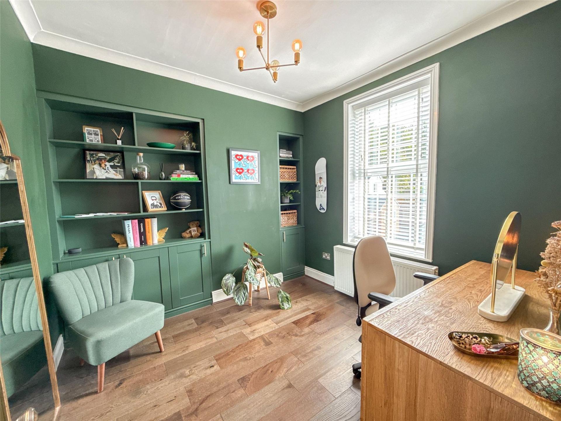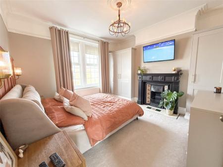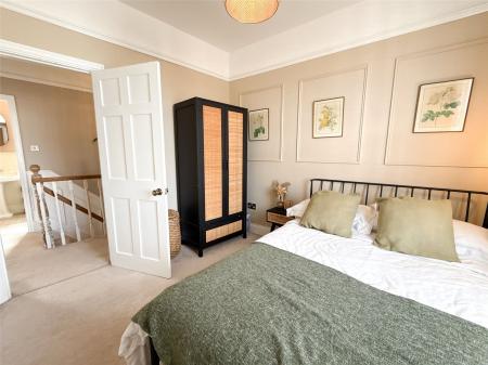 The first floor hosts three beautifully presented bedrooms. The main bedroom is a true retreat, enhanced by coving, a central ceiling rose, and a traditional style fireplace, with built-in wardrobes fitted neatly into the alcoves. Decorative faux panelling to one wall adds extra visual interest. The additional bedrooms are equally appealing, offering versatility for family, guests, or home working.