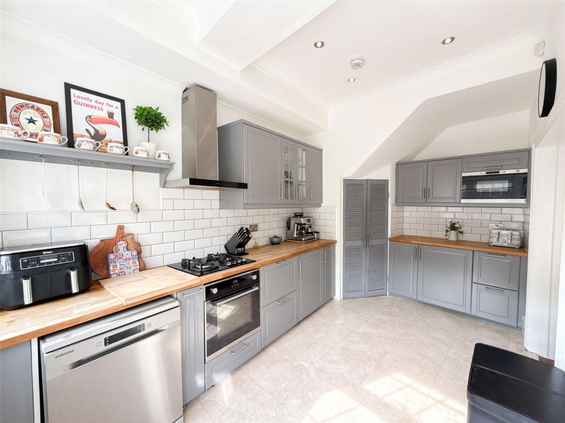 The kitchen itself is a modern delight, fitted with a superb range of units and complemented by built-in cooking appliances including a high-level microwave, integrated fridge/freezer, and a useful pantry-style cupboard. A door from the kitchen leads out to the rear courtyard, making al fresco dining just steps away.
