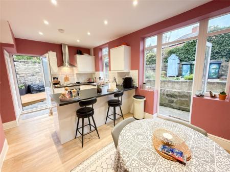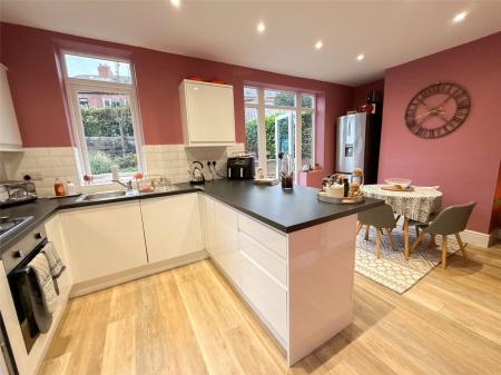 To the rear of the property lies an open-plan dining kitchen, finished with a stylish range of modern units and built-in cooking appliances. The kitchen also includes a breakfast bar, ideal for casual dining, while the adjoining dining area offers ample space for a dining table and chairs and provides direct access to the rear garden, making it perfect for both everyday living and entertaining.