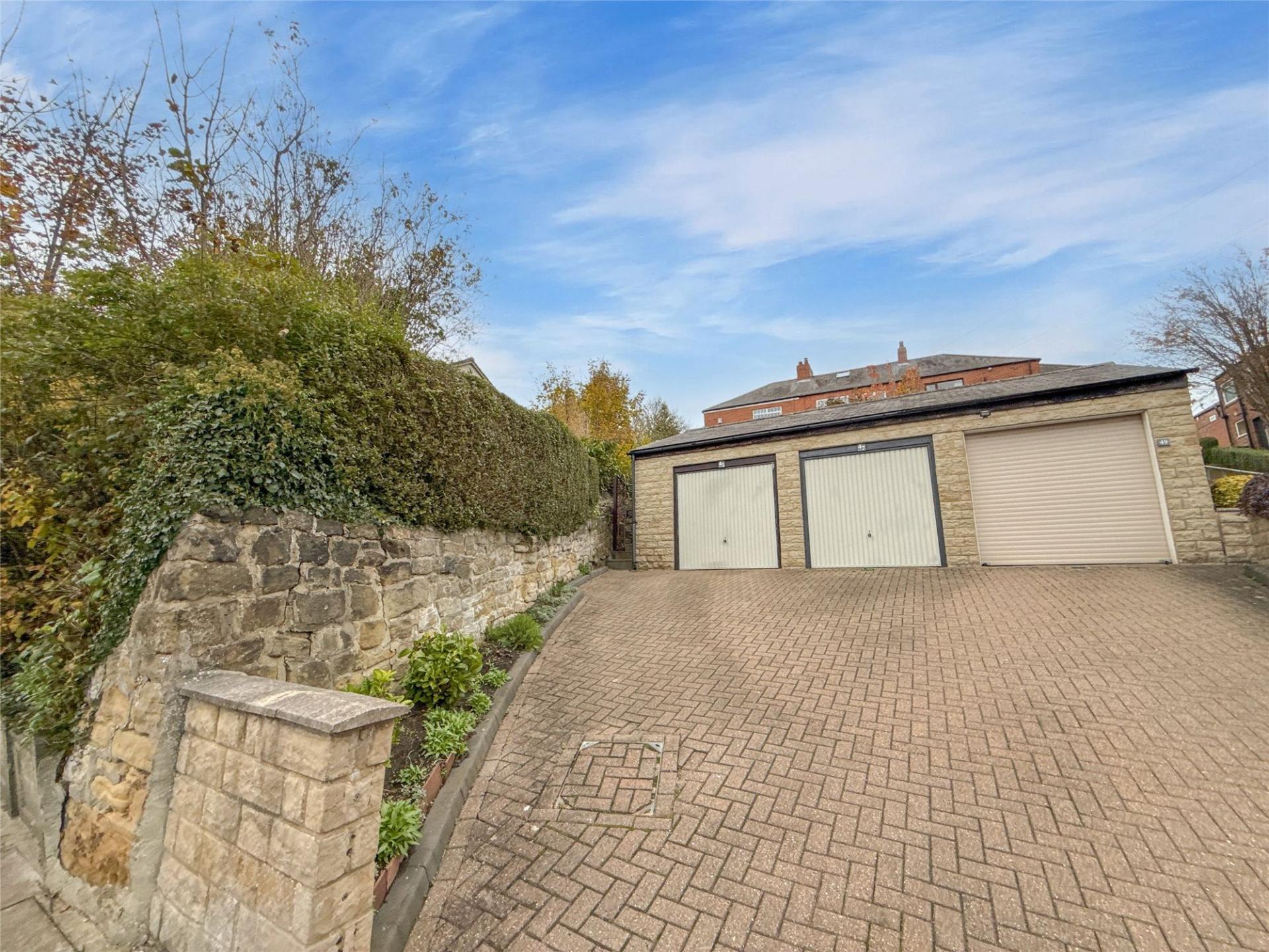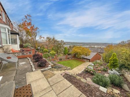 Externally, the home sits within beautifully landscaped gardens. To the front, a block-paved driveway provides off-road parking and access to the single garage, while the front garden features a neat lawn, flowering shrubs, and a paved seating area where you can unwind and take in the fabulous outlook. To the side, there is a paved patio and a timber-decked sun terrace, ideal for outdoor dining, entertaining, or simply relaxing. The paving continues around to the rear, where steps lead up to an elevated, planted garden with a selection of shrubs and bushes.
