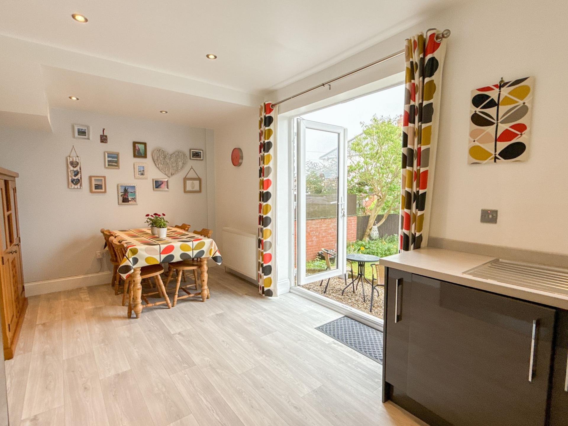 To the rear of the property lies a stunning, open-plan fitted dining kitchen which serves as the heart of the home. This well-appointed space boasts a range of sleek and stylish wall and base units, contrasting work surfaces, built in cooking appliances, and ample space for dining furniture. Patio doors open directly onto the rear garden, allowing for a seamless transition between indoor and outdoor living and providing the ideal setting for al fresco dining or summer gatherings.