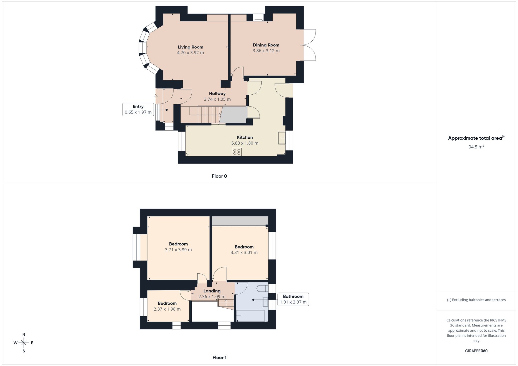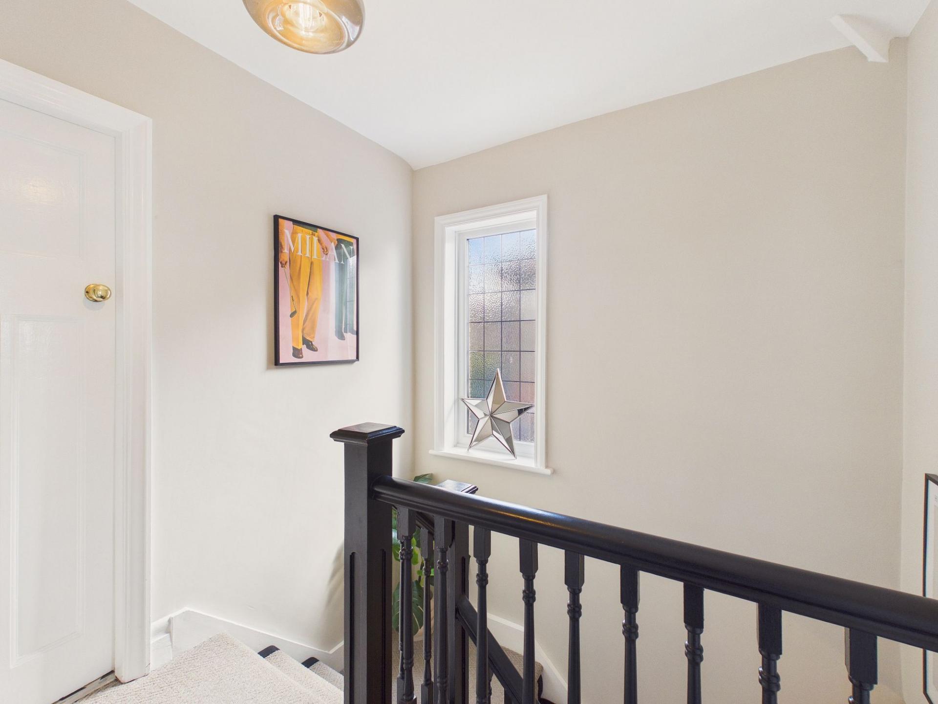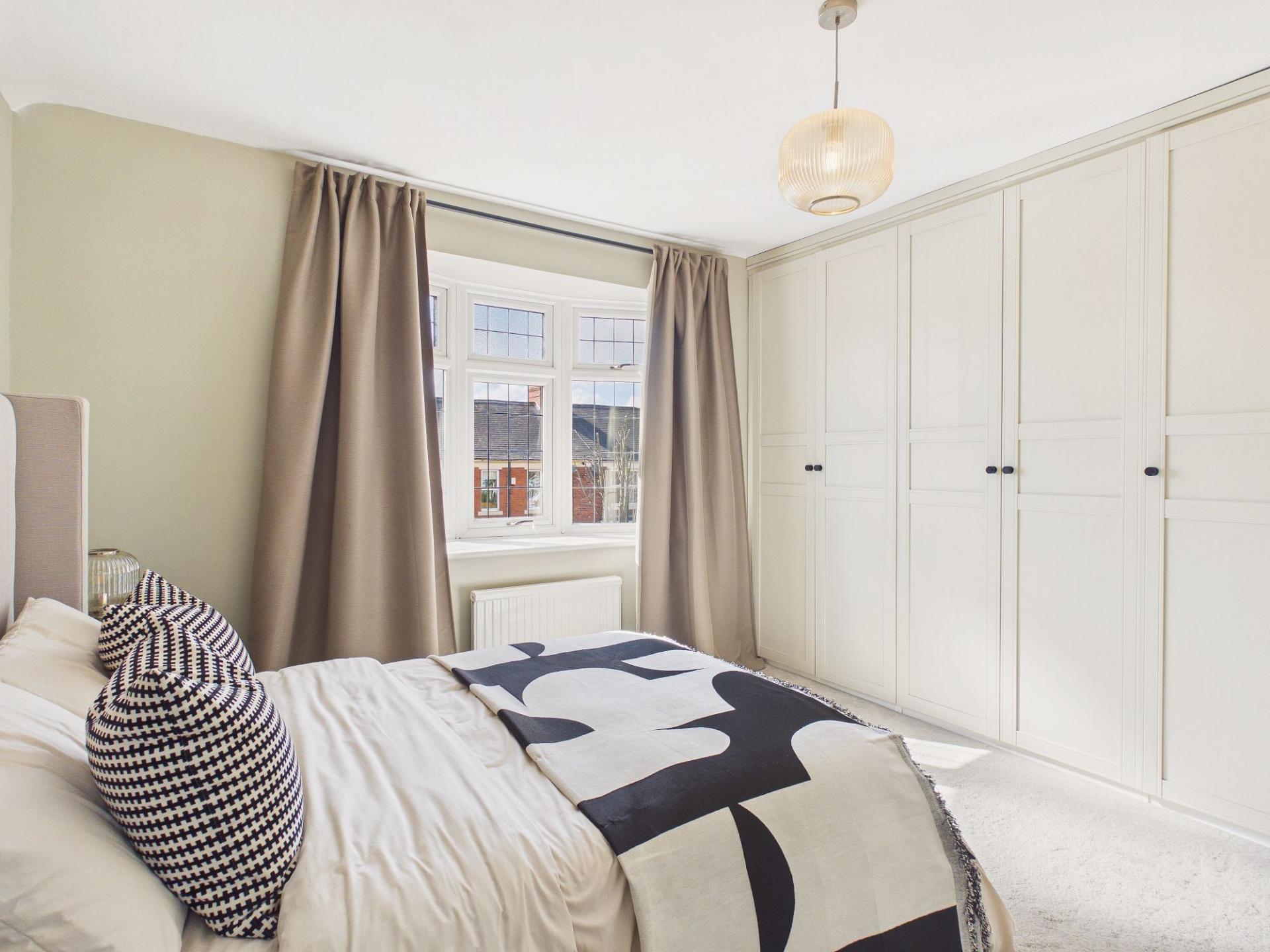To the first floor, the property continues to impress. The landing benefits from a side-facing window and provides access to three bedrooms and the family bathroom. The main bedroom, situated to the front, boasts a charming bow window and is further enhanced by a range of modern fitted wardrobes, offering excellent storage. The second double bedroom overlooks the rear garden and includes built-in mirrored sliding wardrobes, creating a sleek and practical finish. The third bedroom offers versatility and could serve as a guest room, nursery, or home office.