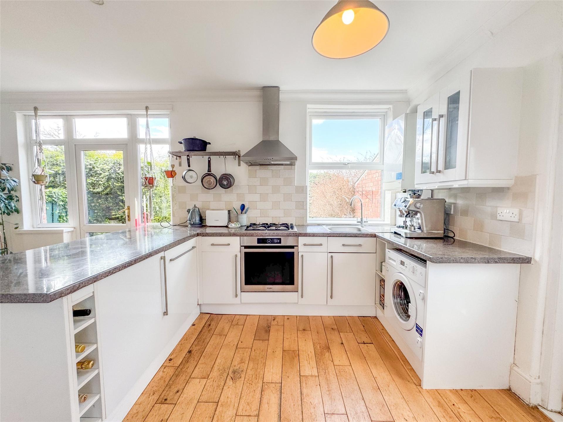 At the heart of the home lies a beautifully modern open-plan dining kitchen, designed for both everyday living and special occasions. Complete with a stylish breakfast bar, built in cooking appliances, and seamless access to the enclosed west facing garden, this space is ideal for hosting and unwinding alike.