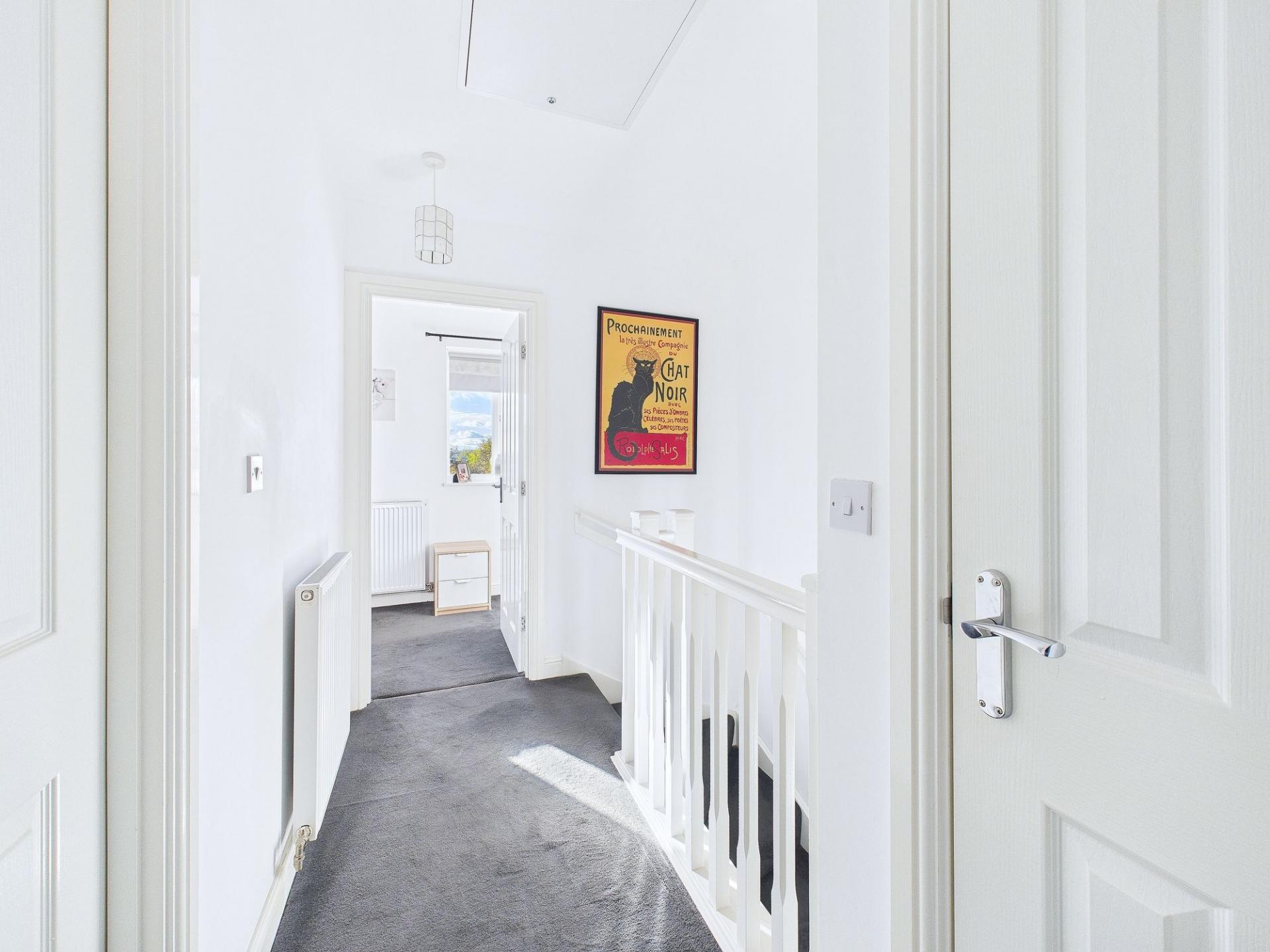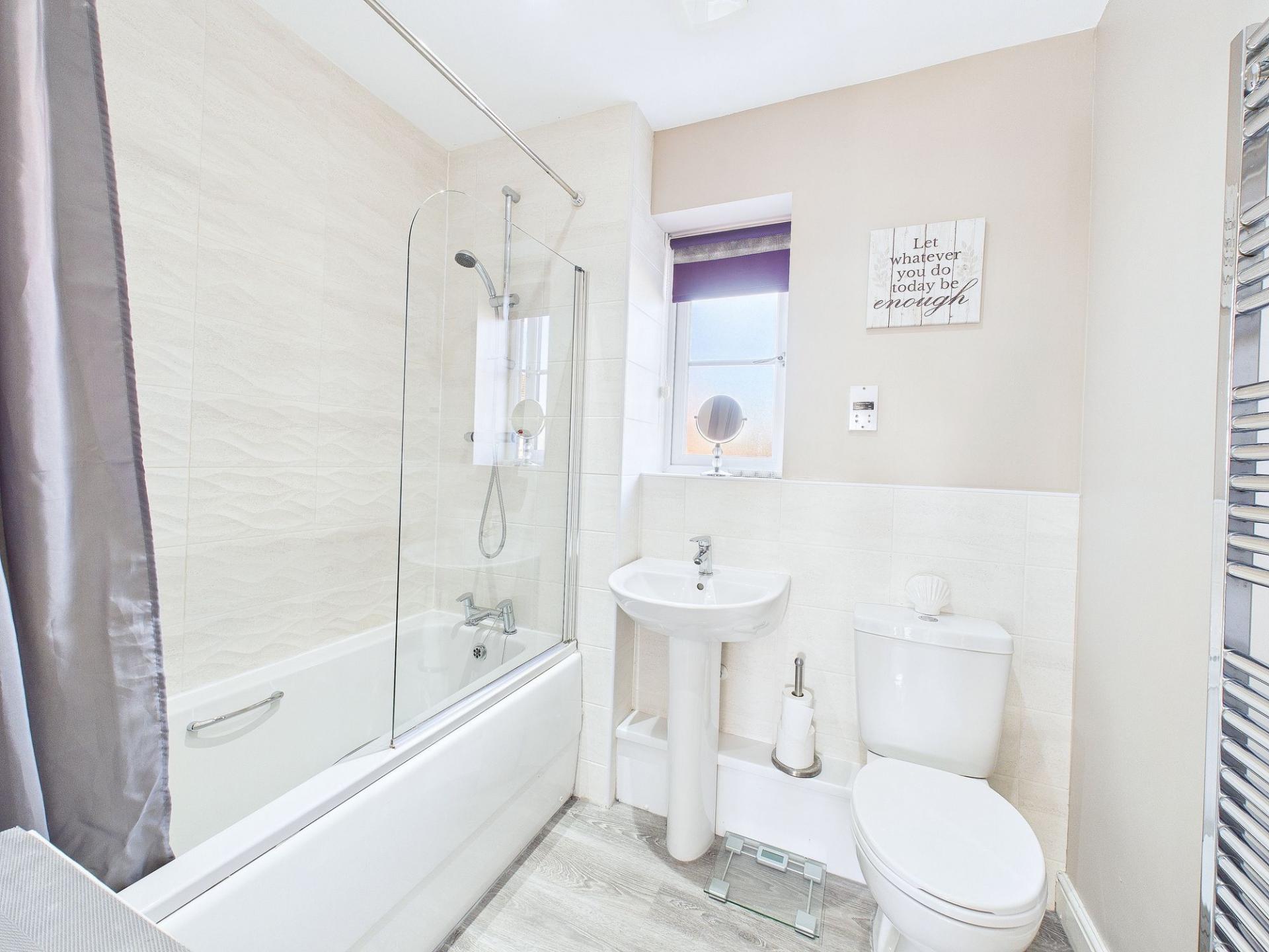 Upstairs, there are two generously sized double bedrooms. The main bedroom benefits from a built-in double wardrobe, providing storage space without compromising on floor space. Completing the accommodation is a modern family bathroom, fitted with a white suite and featuring a mains-fed shower over the bath.