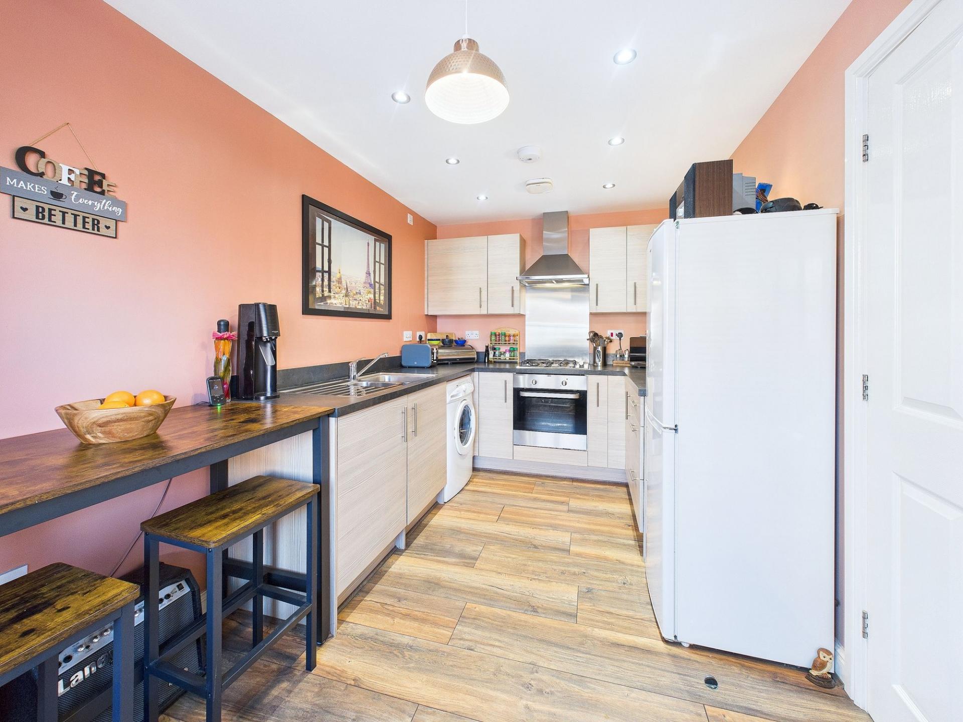 To the front aspect lies the modern fitted dining kitchen, thoughtfully designed with a stylish square bay window and a comprehensive range of units offering ample storage. The kitchen is equipped with built in cooking appliances, sleek work surfaces, and designated space for additional white goods, making it an ideal setting for both everyday living and entertaining.