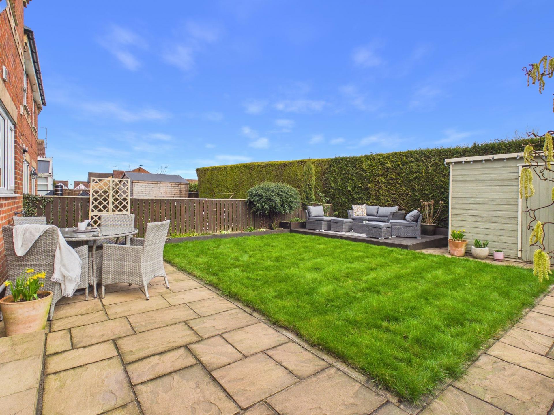 Externally, this superb home continues to impress. At the front, a block-paved driveway provides off-street parking alongside a neat lawned garden. To the rear, the landscaped garden is a true highlight, featuring a generously sized paved patio, a central lawned area, and a timber decked sun terrace, perfect for relaxing, entertaining, or enjoying outdoor family time.