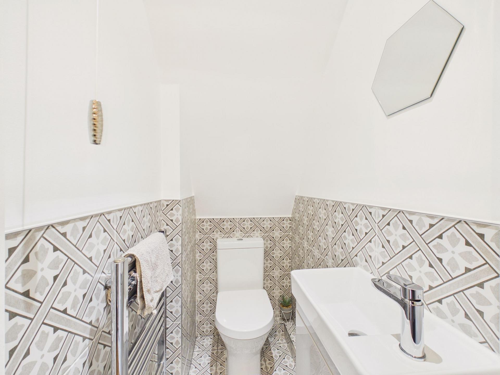 Upstairs, the beautifully presented main bedroom benefits from a luxurious en-suite, complete with a mains-fed rainfall shower, a WC with concealed cistern, and a hand wash basin set within a sleek vanity unit. The remaining two bedrooms are served by the family bathroom, which also features a mains-fed rainfall shower over the bath, WC, and a hand wash basin set to a vanity storage unit, ensuring comfort and convenience for all members of the family.