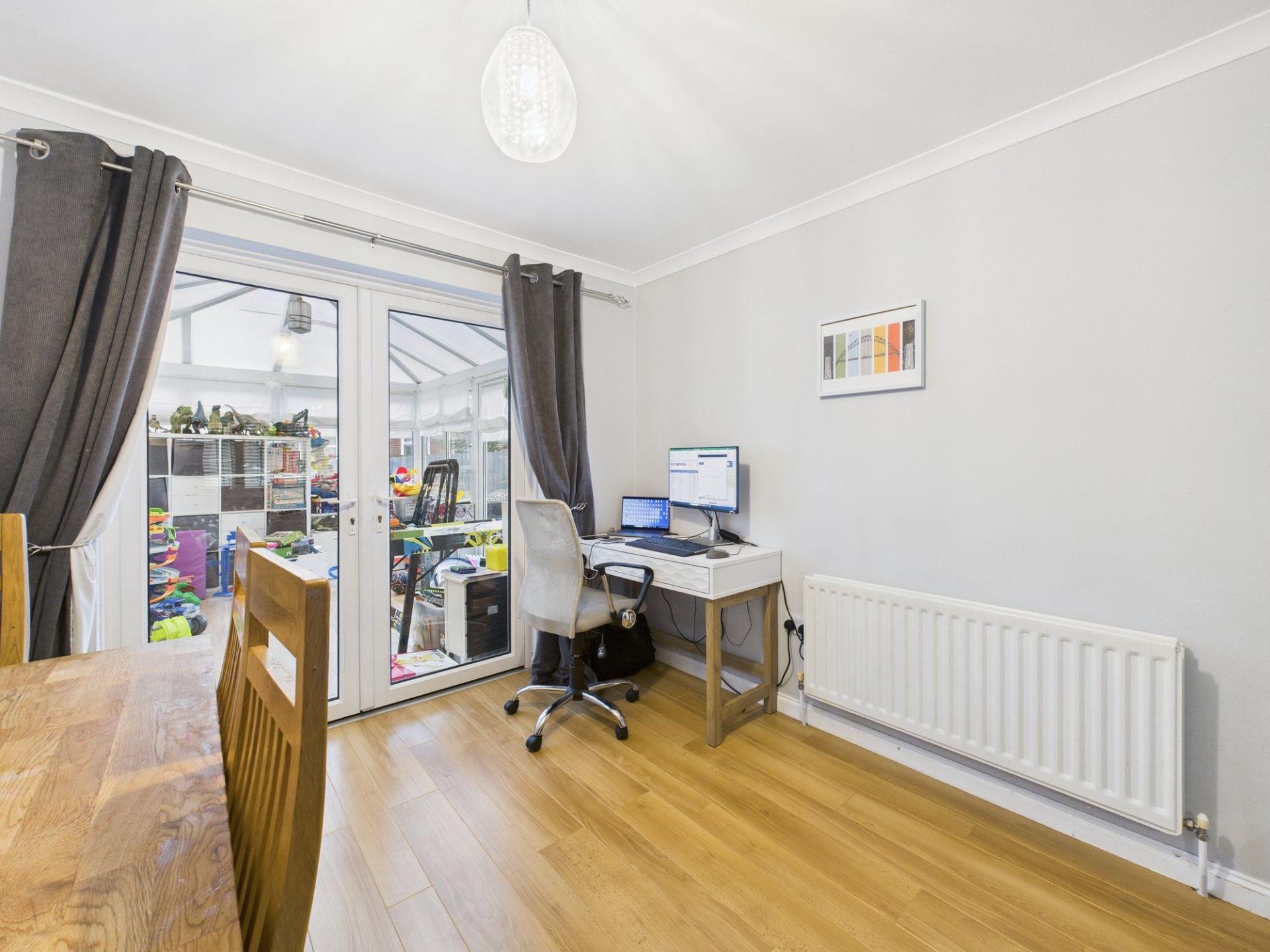Upon entering, an entrance hallway provides access to the main accommodation. The well-proportioned lounge/diner offers a comfortable and versatile living space. From here, double doors open into a spacious conservatory providing an additional reception space that can be enjoyed all year round. The conservatory enjoys pleasant views over—and direct access to—the enclosed, west-facing rear garden, making this an ideal spot for outdoor dining, family play or simply unwinding in the afternoon sun.