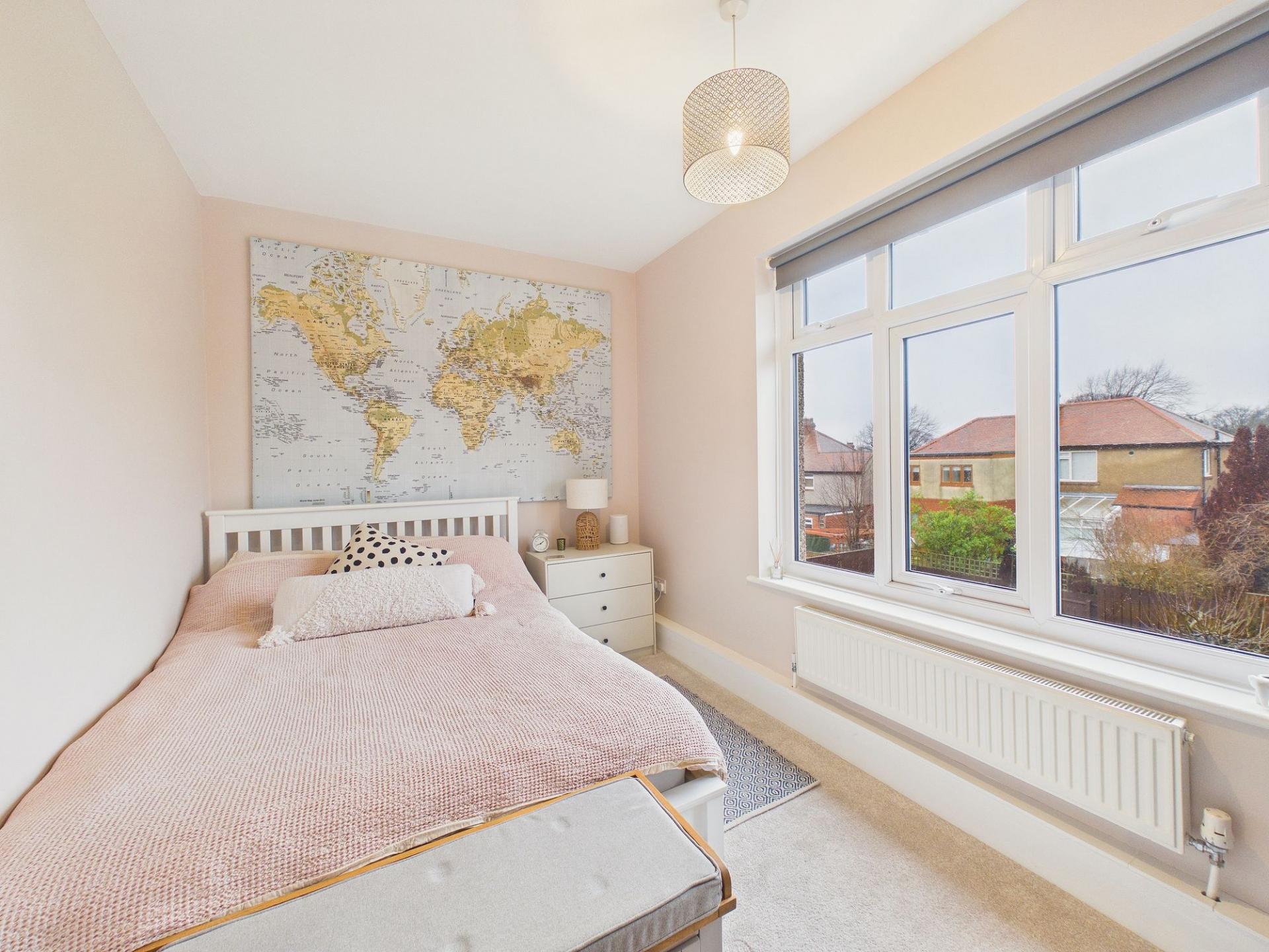 Upstairs, the property continues to impress with two well-proportioned double bedrooms, each offering comfortable and versatile living space. The modern bathroom is beautifully appointed and features a white suite with a mains-fed shower over the bath, providing both convenience and comfort. There is also a feature arched window on the landing.