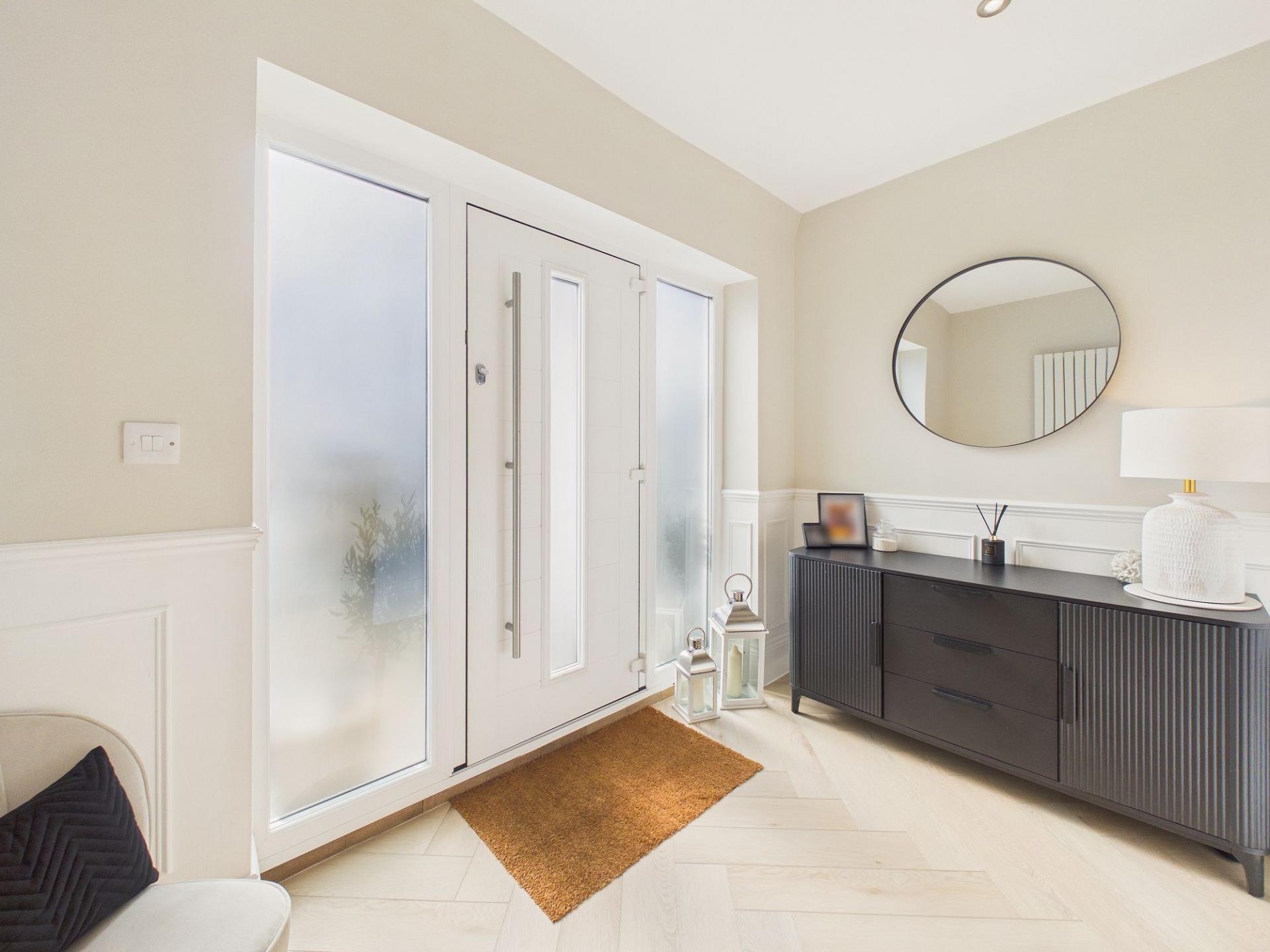 Approached via a low maintenance style front garden with artificial lawn and hedgerow, you enter the spacious and welcoming porch through a composite glazed door. From here glazed internal double doors lead into a beautifully presented hallway, complete with attractive flooring and decorative wall panelling, setting the tone for the rest of the home.