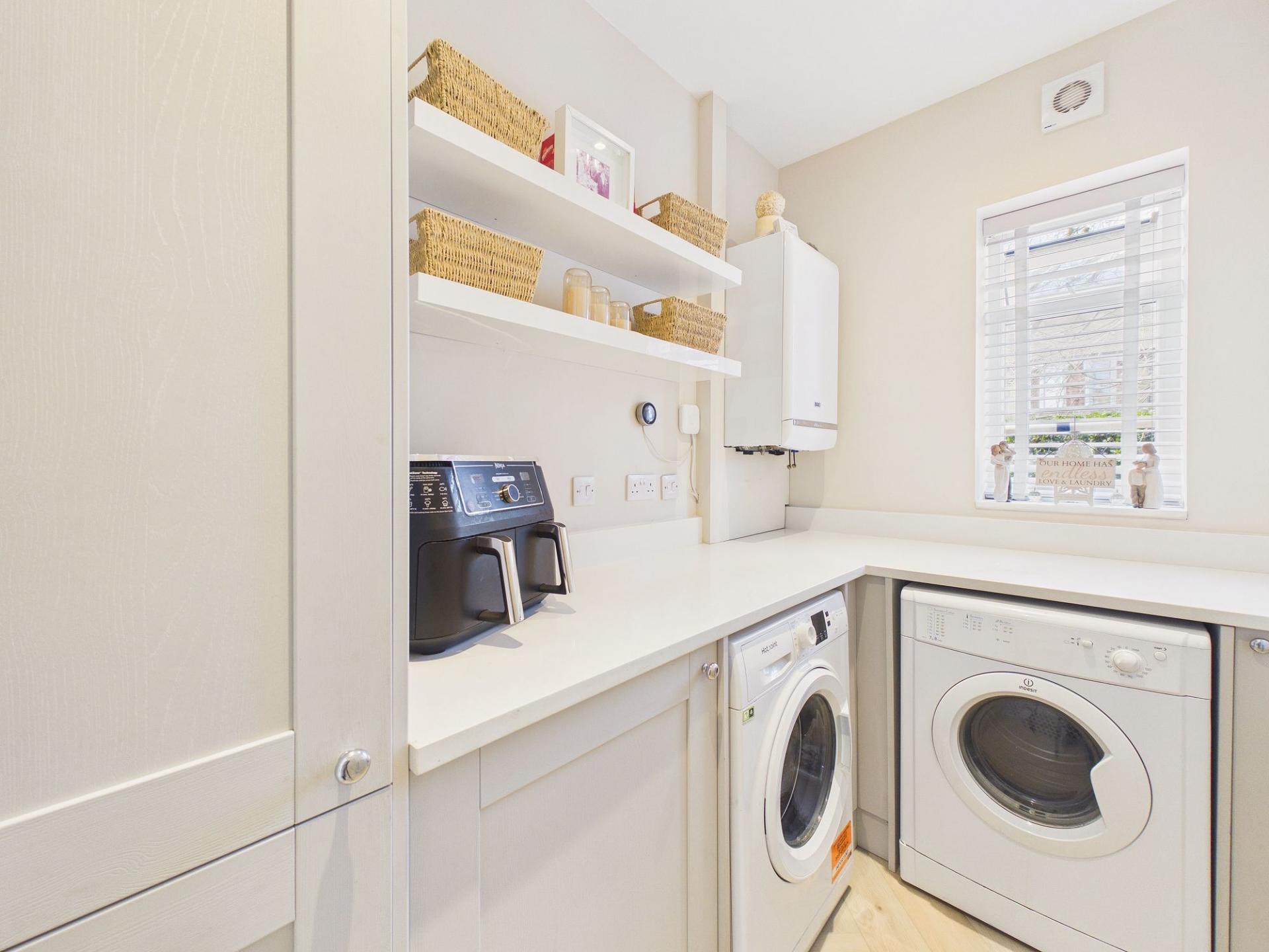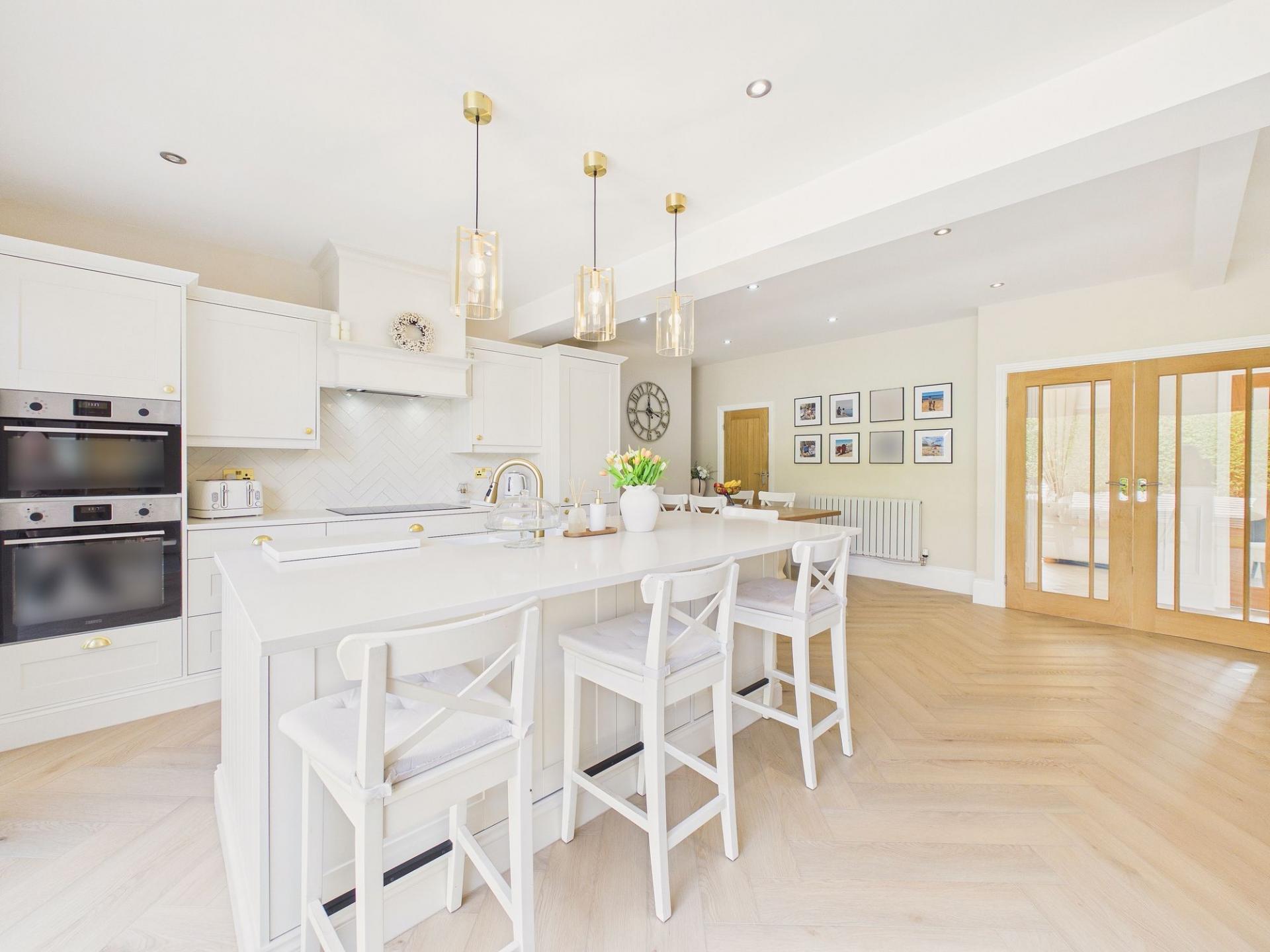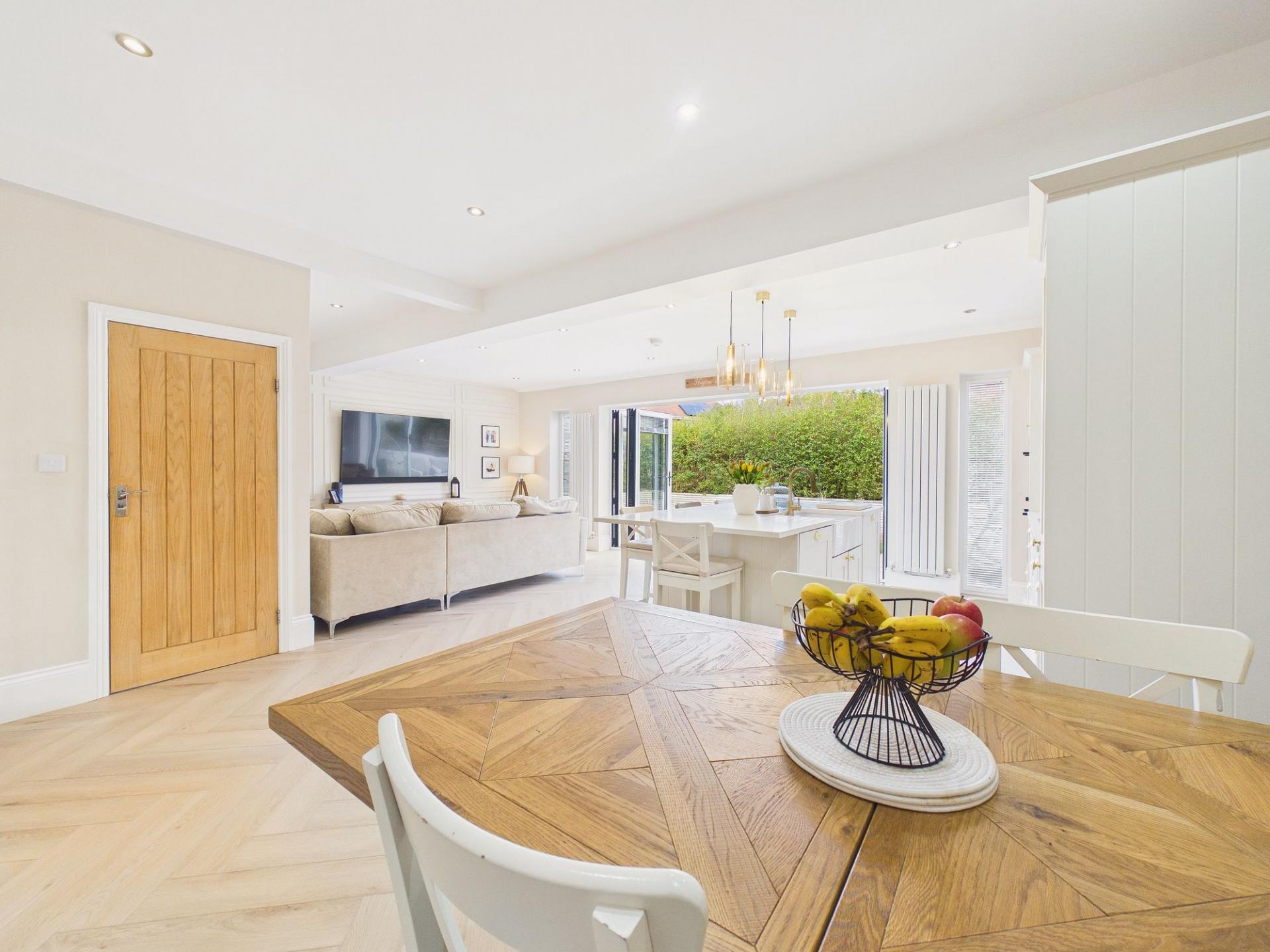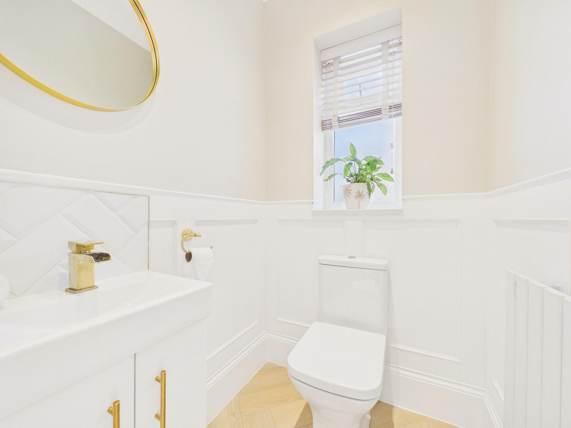 The elegant formal lounge to the front is beautifully presented and enhanced by a bay window and a feature electric stove set within an attractive surround. To the rear, the impressive open plan kitchen, dining and living area is the heart of the home, boasting bi-fold doors and full-height windows that open onto an attractive enclosed garden. This impressive space is perfectly suited to modern family living and entertaining, shown to accommodate a dining table and chairs as well as a relaxing seating space enhanced by a striking feature panelled wall. The kitchen area is fitted with a range of contemporary shaker style units, complemented by stunning work surfaces and a central island with double Belfast style sink and breakfast seating. Integrated appliances include an eye level oven, induction hob, dishwasher and fridge freezer. The separate utility room is accessed via the kitchen and fitted with a range of co-ordinating units providing additional storage and laundry space, with plumbing and space for appliances. A guest WC completes the ground floor accommodation.