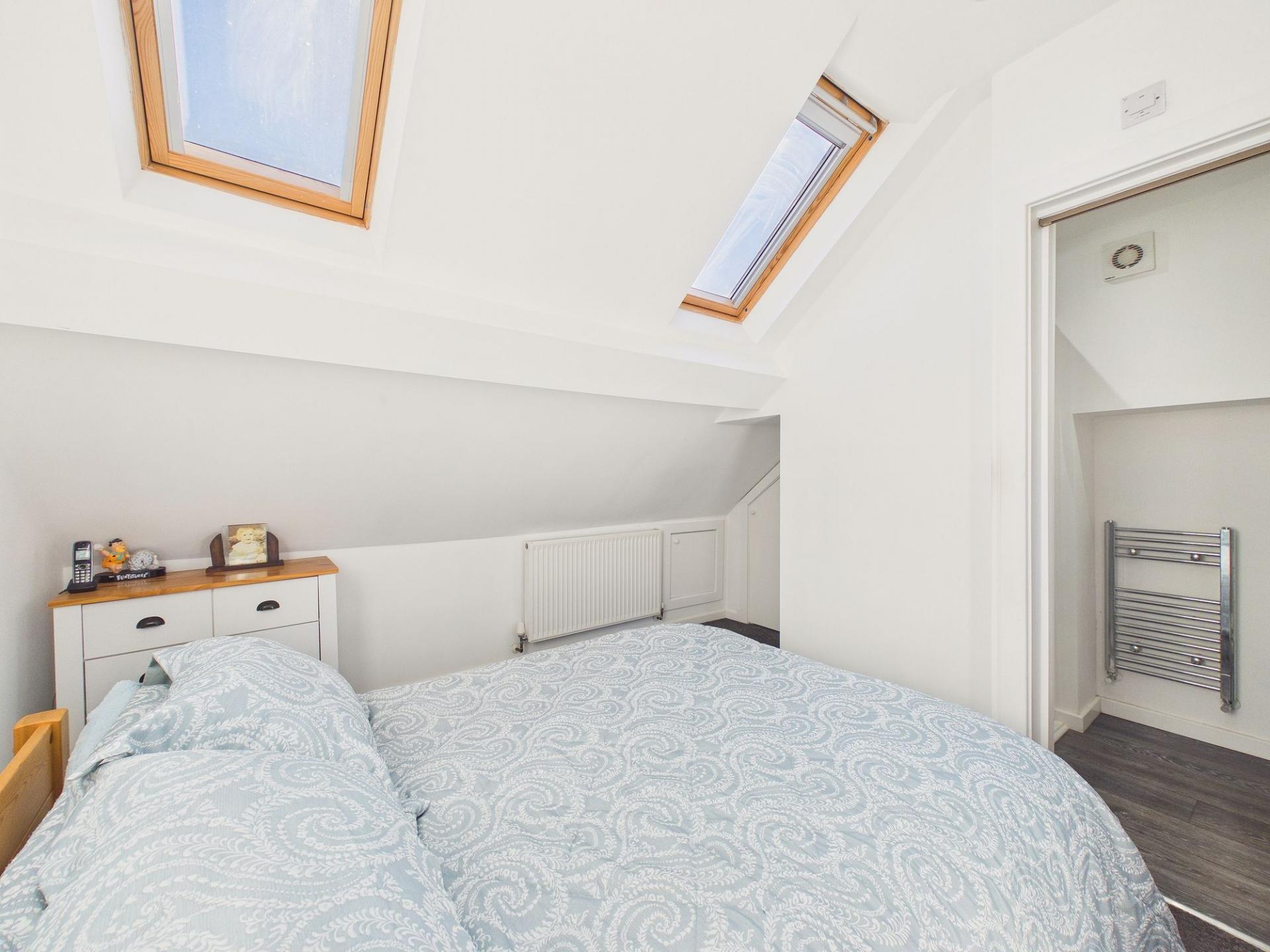To the first floor, the main bedroom is enhanced by three Velux-style windows, increasing the introduction of natural light to the room. The room also benefits from access to a well-appointed en-suite shower room.