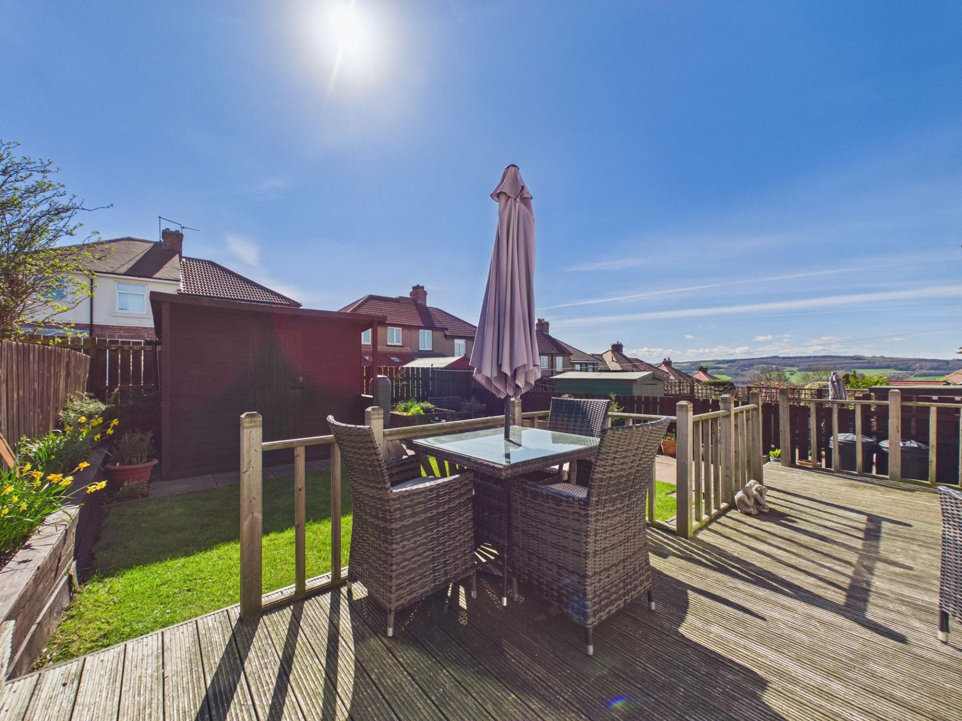 Externally, the property continues to impress. The front garden is neatly presented and complemented by a block paved driveway providing off-street parking. To the rear, the enclosed south-facing garden is a true highlight, offering a perfect blend of lawn, paved patio, and a raised decked sun terrace. This elevated seating area is ideal for relaxing or entertaining while enjoying the panoramic views.