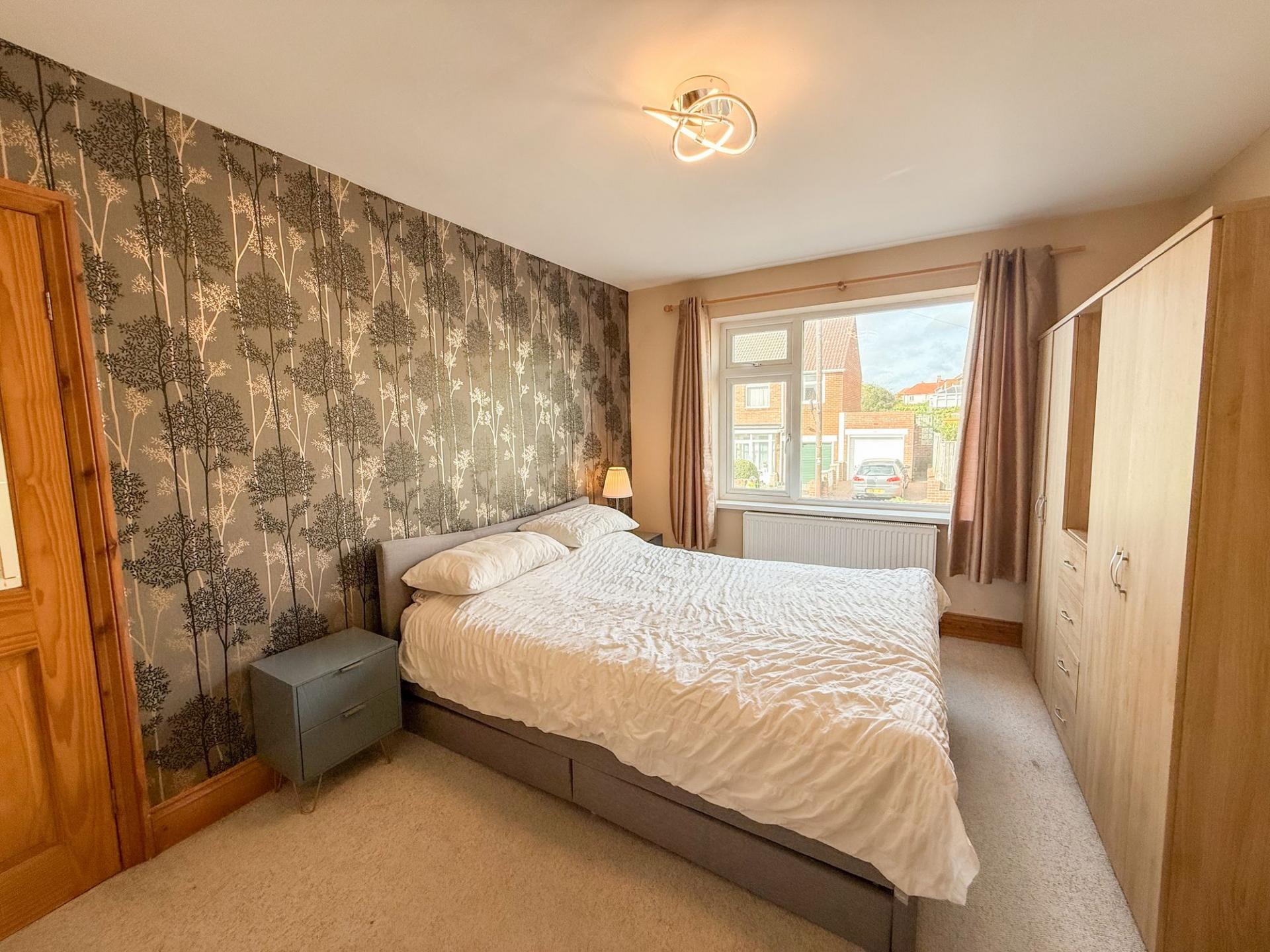 The principal bedroom features a window to the front aspect and a striking accent wall. The second bedroom enjoys spectacular views to the rear, while the third bedroom, also to the front aspect, includes a built-in double wardrobe for convenient storage.