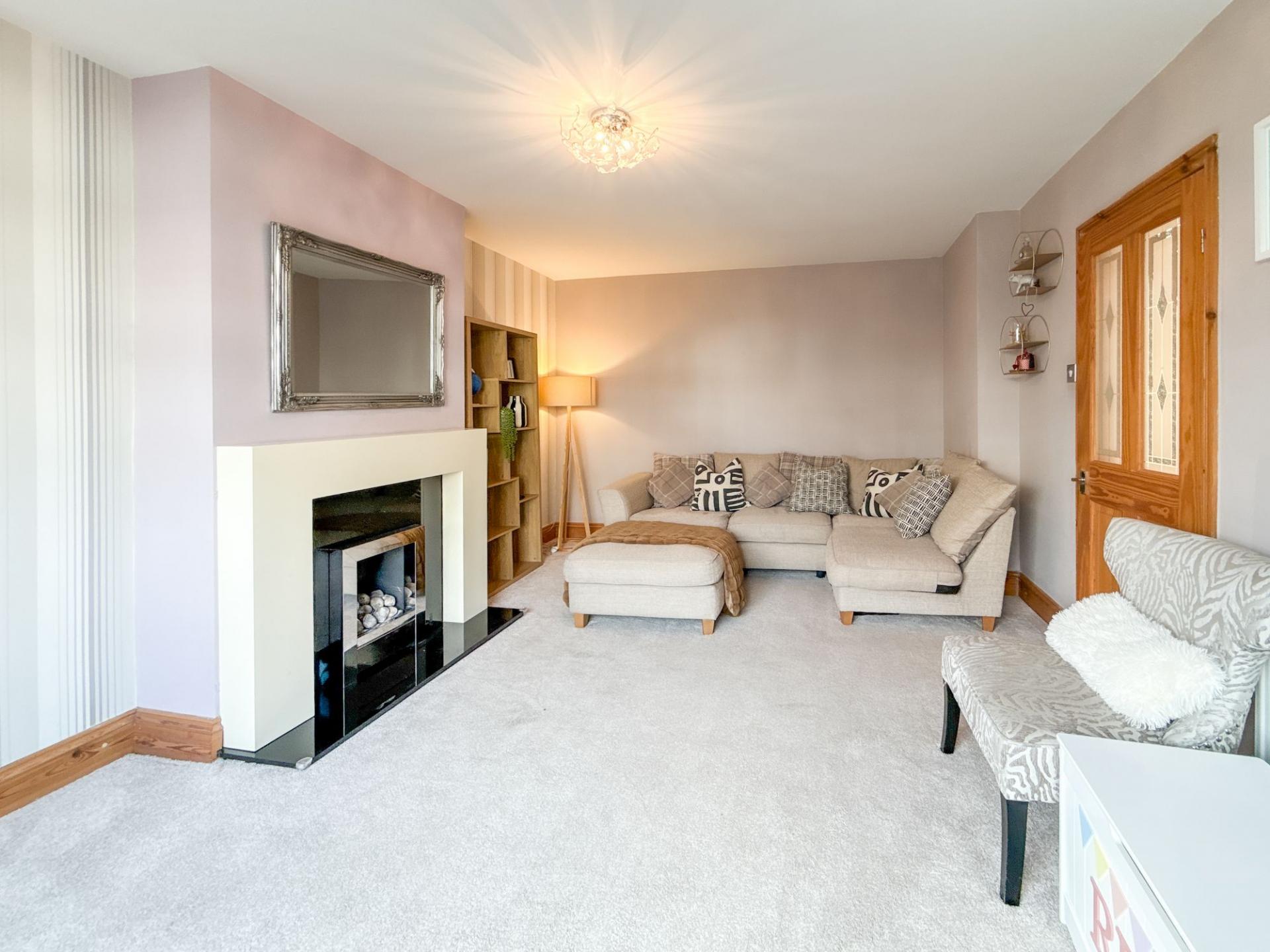 The lounge, positioned to the front of the property, is a warm and inviting space featuring a double glazed window and a gas living flame effect fire with a feature wall, providing a cosy focal point for relaxing evenings.
