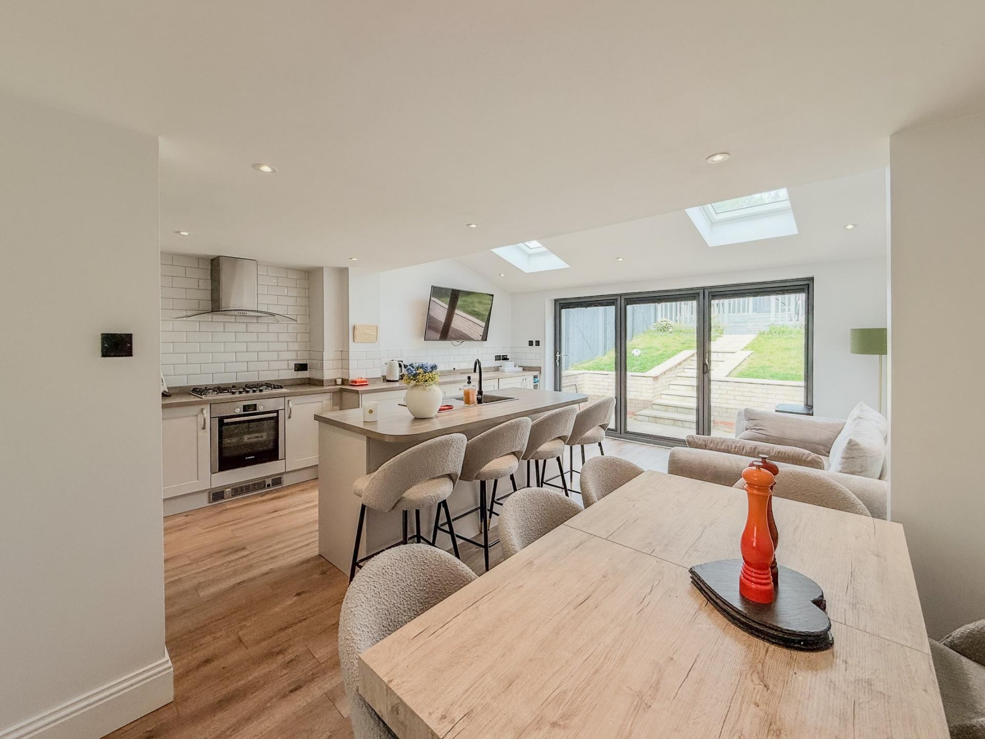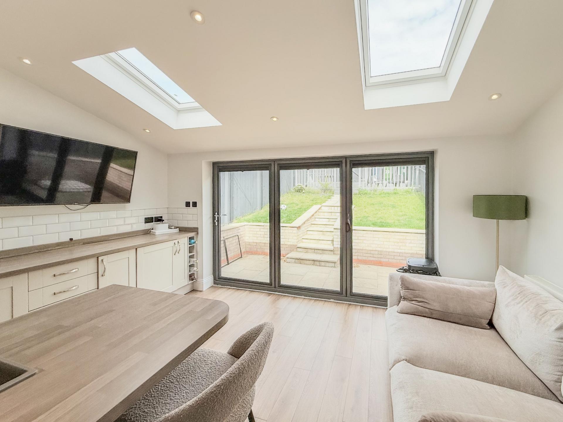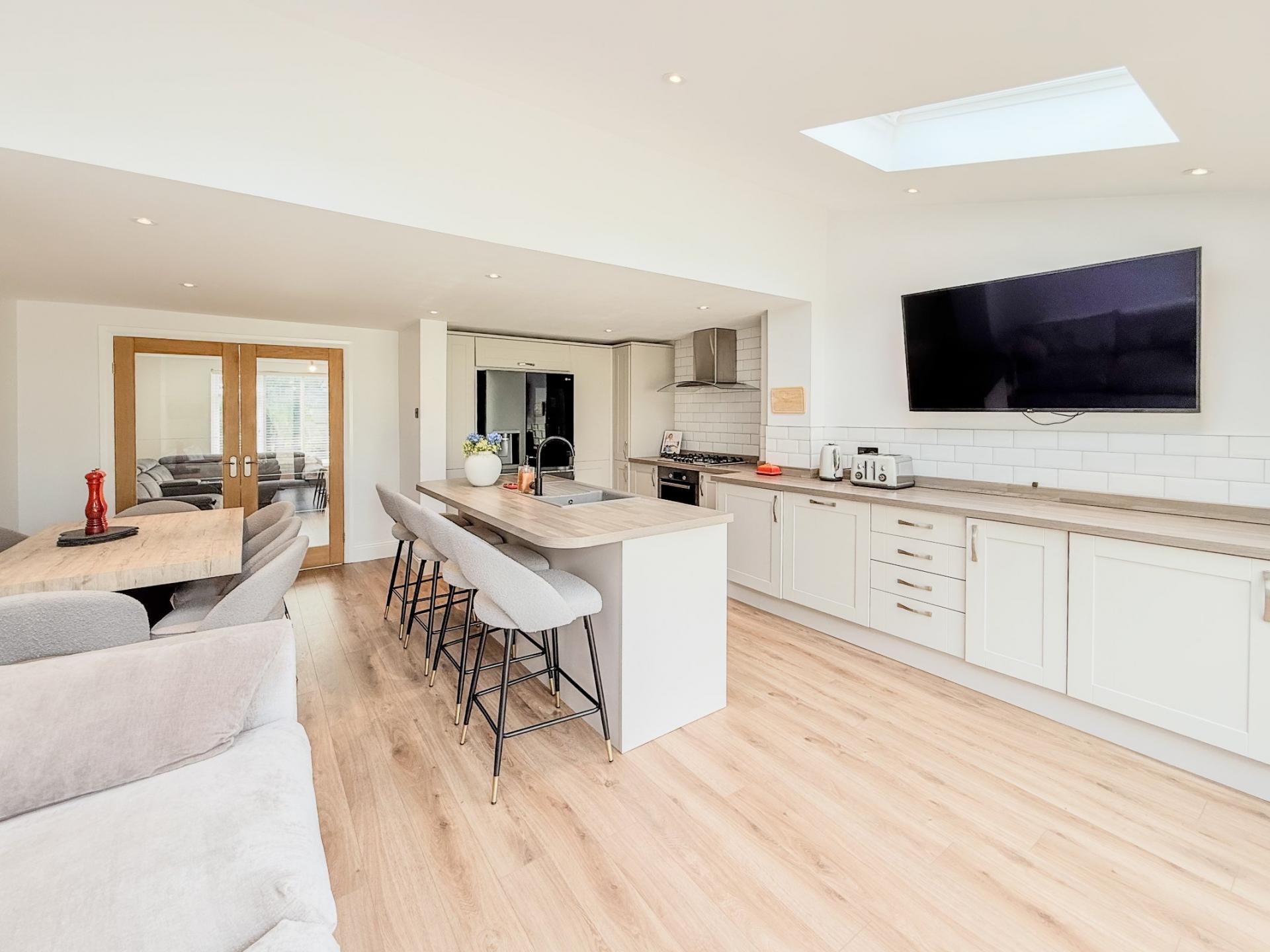 The true heart of this home lies to the rear, where a spectacular open-plan kitchen, dining and family area spans the full width of the house. This impressive space has been designed with both style and functionality in mind, offering an attractive fitted kitchen with a comprehensive range of units, sleek built-in cooking appliances, and a central island complete with a breakfast bar, ideal for casual meals or social gatherings. The space is shown to accommodate both dining and lounge furniture, creating a flexible layout for everyday family living. Bi-folding doors, flow seamlessly out to the rear garden, blurring the lines between indoor and outdoor living.