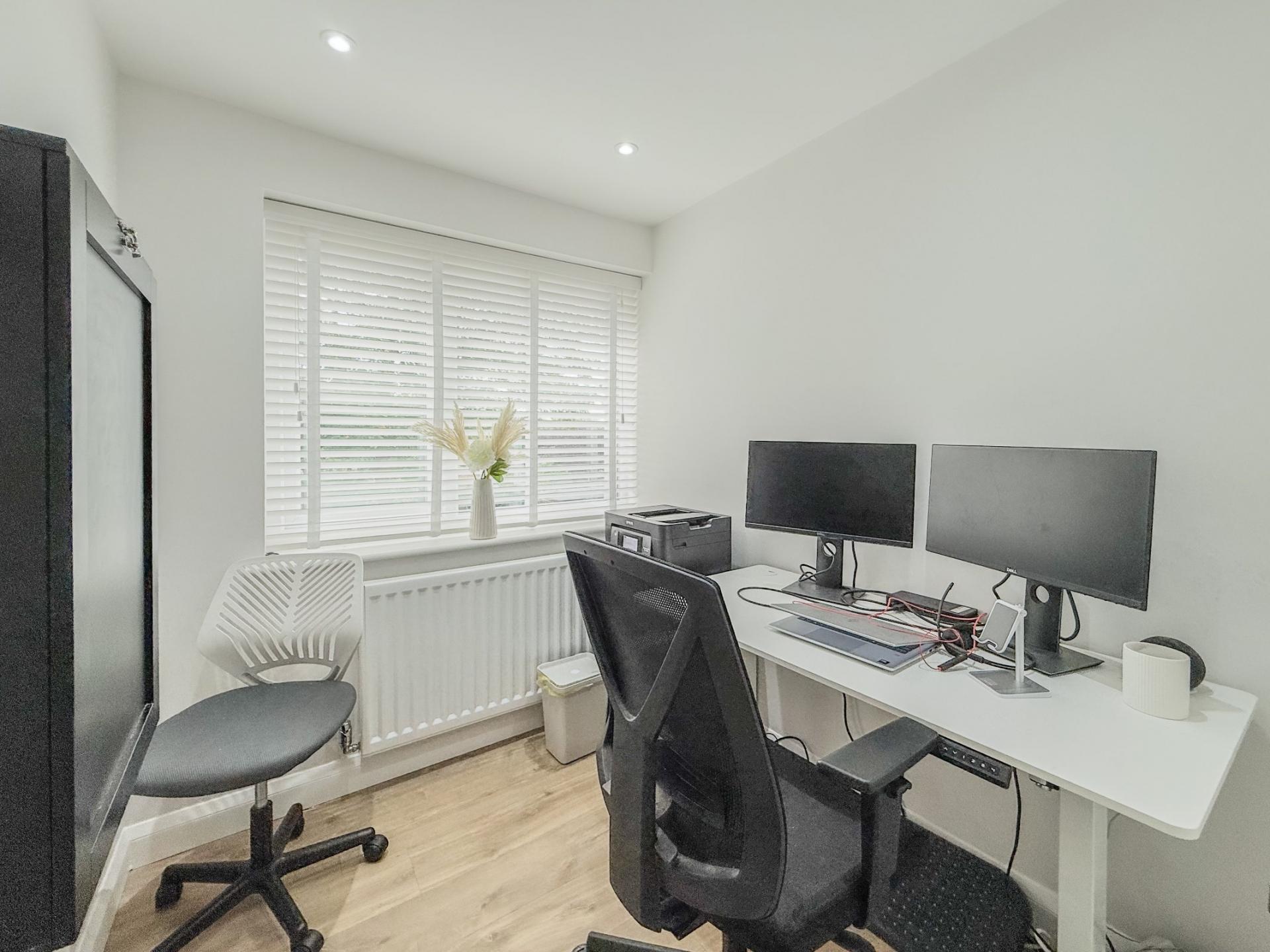 Externally, the property continues to impress. To the front, a neat lawned garden adds kerb appeal, while the rear boasts a south facing tiered garden. This outdoor oasis is thoughtfully landscaped with a lower patio area perfect for alfresco dining, a central lawned section, and a raised patio at the far end finished with low maintenance artificial grass, ideal for relaxing or hosting friends and family. A garage is conveniently located in a nearby block, providing secure parking or additional storage.