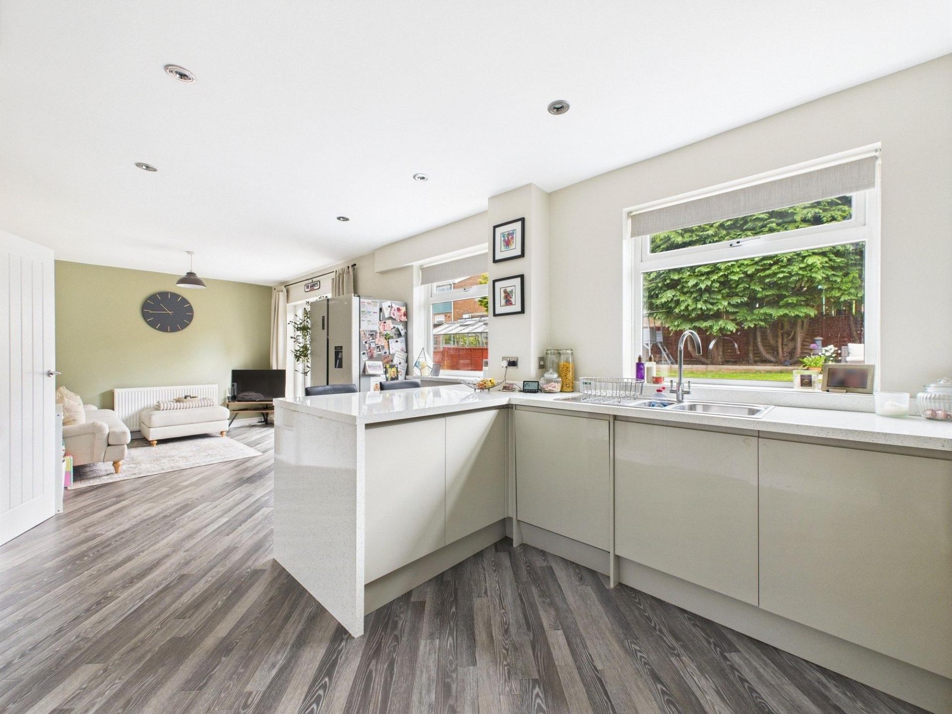 The heart of the home is the truly outstanding open-plan dining kitchen. Designed with both aesthetics and functionality in mind, this space boasts a stylish range of wall and base units, built in cooking appliances, and a stylish breakfast bar for casual dining. The dining area comfortably accommodates a table and chairs, making it ideal for both everyday family meals and entertaining guests. Patio doors provide a seamless connection to the rear garden.