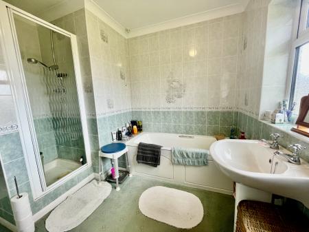 BATHROOM 10' 2" x 8' 10" (3.10m x 2.70m) Four piece suite comprising panelled bath, low level WC, pedestal wash hand basin, independent shower cabinet, fully tiled walls, radiator, ceiling light, obscure glazed UPVC window.
