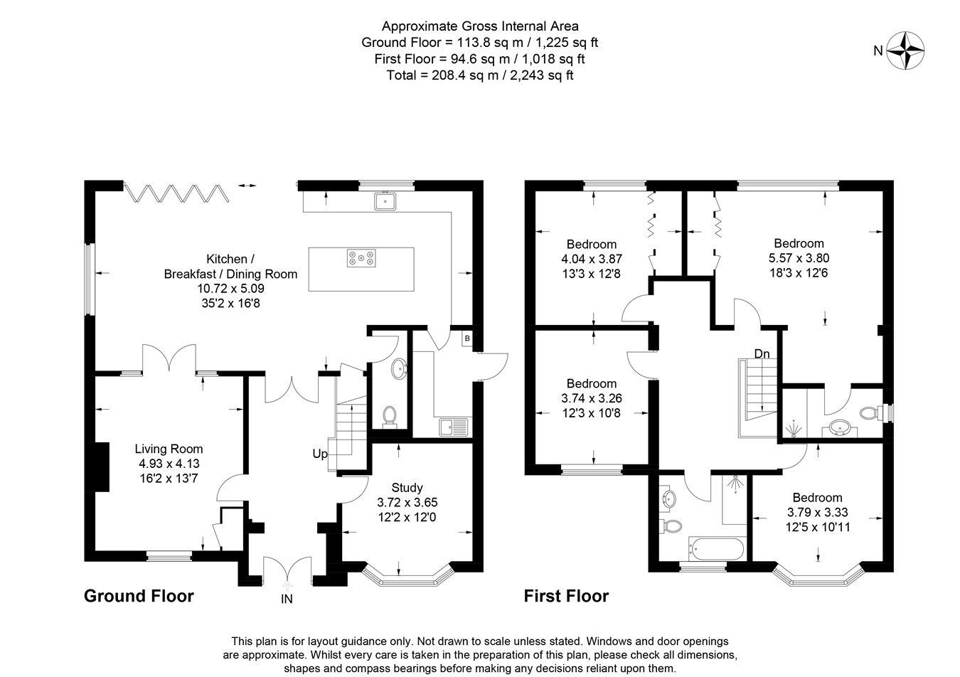 The ground floor comprises a spacious living room, a large open-plan kitchen/dining area ideal for entertaining, a separate study/home office, utility room, and a guest WC. Upstairs, there are four well-sized double bedrooms and a modern family bathroom and en-suite bathroom of the master bedroom.