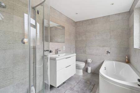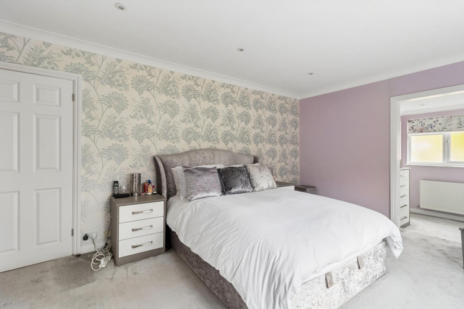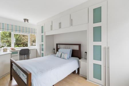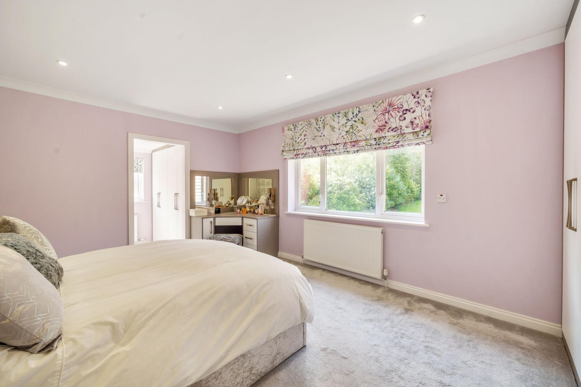 Upstairs, bedroom one is a superb size, with a large window enjoying views over the garden. The bedroom benefits from fitted wardrobes, a separate dressing area, and a well-appointed en suite bathroom complete with a separate bath and shower and underfloor heating.
