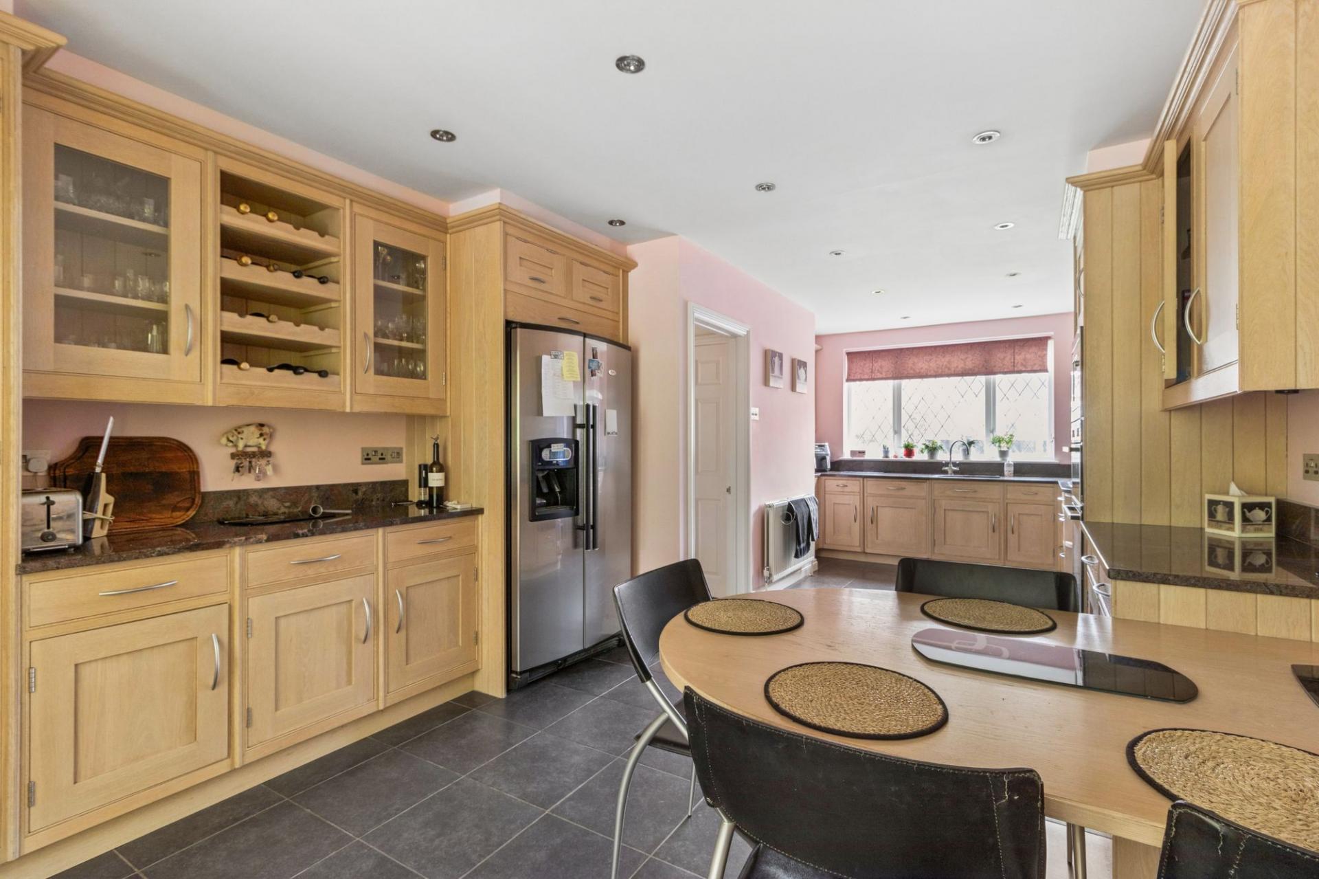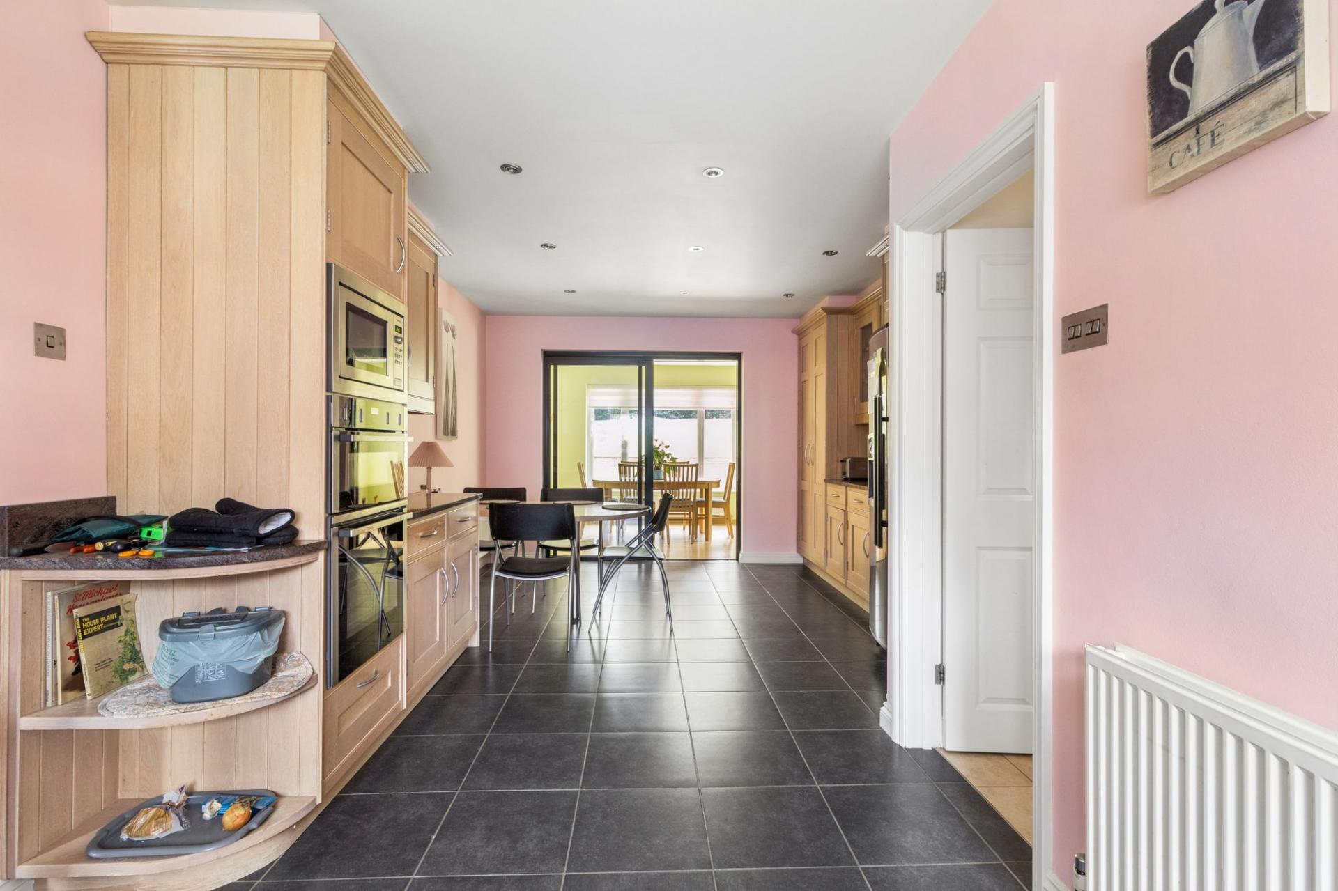 The kitchen is a standout feature, beautifully designed, generously proportioned, and fitted with integrated appliances. There is ample space for dining, including a built-in breakfast table at the far end, making it an ideal hub for family life and entertaining. Just off the kitchen is a family room, perfect for relaxing or as a children’s space.