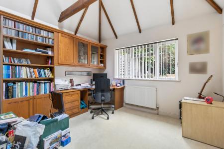 Beyond the family room is a large utility room, offering excellent additional storage and practicality, with a back door leading out to the garden. From this area, there is also a fantastic study, featuring attractive beams and offering a flexible space that could equally suit use as a playroom or hobby room.