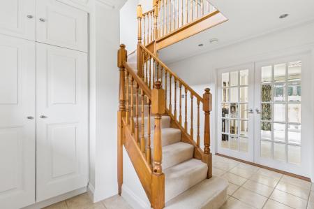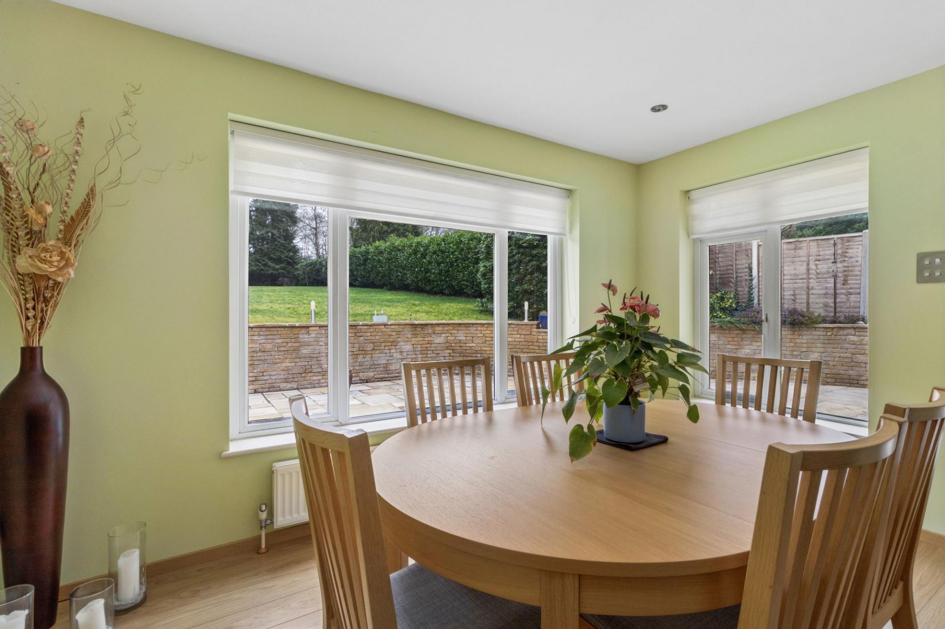 Upon entering the property, you are welcomed into a bright hallway, with a useful storage cupboard to the left, ideal for coats and shoes, and a downstairs cloakroom to the right. Straight ahead, double doors open into a generous and airy drawing room, which enjoys lovely views over the large rear garden, creating a wonderful sense of space and connection to the outdoors.