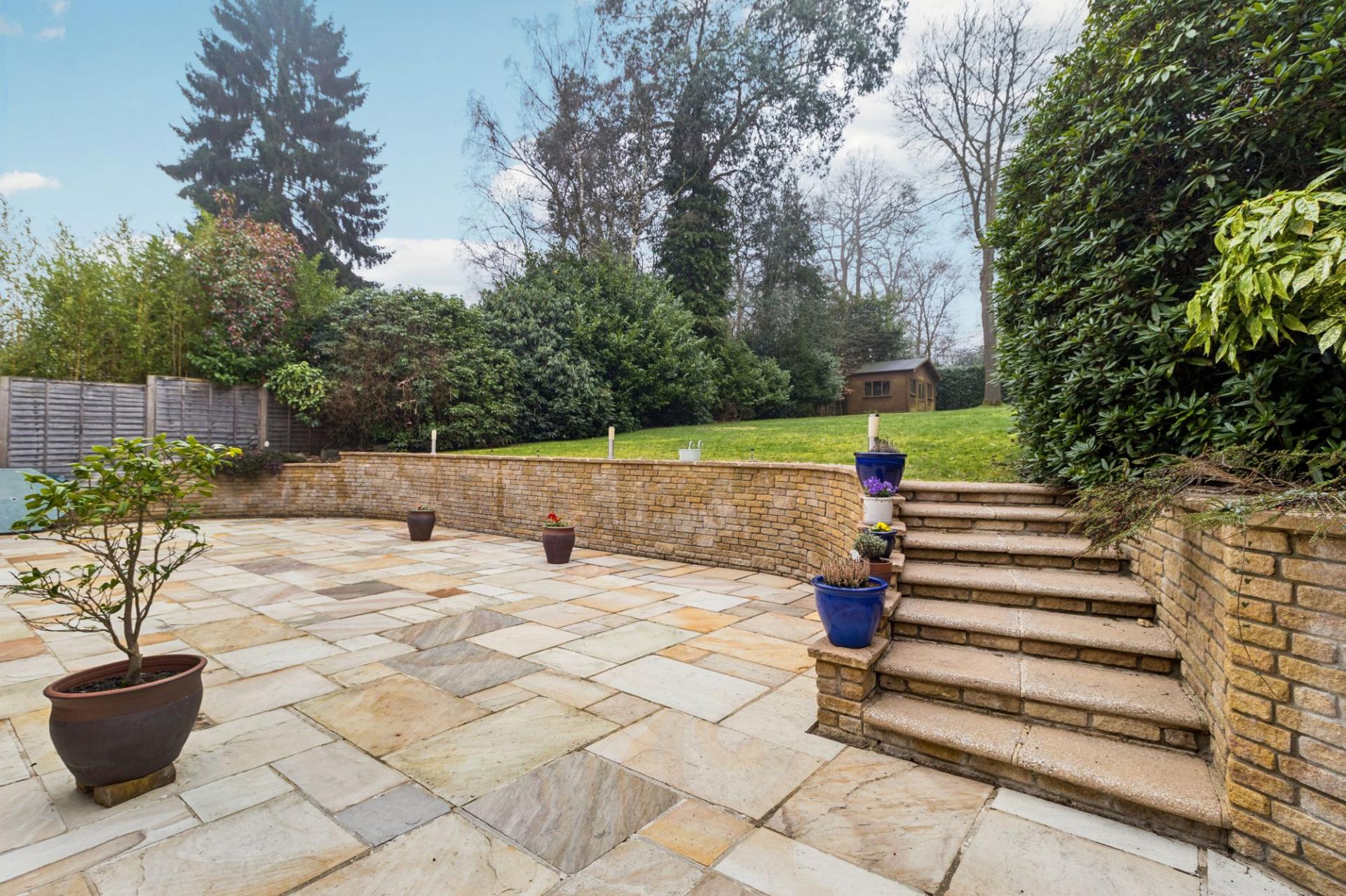 Outside, the property boasts a large south-facing garden, ideal for outdoor living. To the rear left is a substantial storage shed, and at the far corner of the garden a gate provides direct access to a woodland area, adding a wonderful sense of privacy and a natural backdrop.
