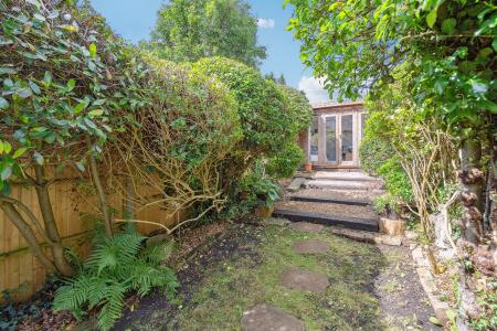 The rear garden is made up of a patio area accessed directly from rear double doors which provides plenty of space for a table and chairs. Stairs lead up to the lawn which has a block paved path leading down to the studio/office outhouse and is surrounded by mature bushes and shrubs. The outhouse is insulated as well as having electrics and a WC.