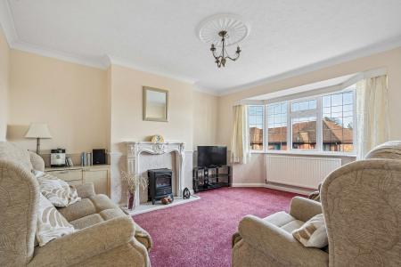 The property features a generous reception room with attractive bay window, a fitted kitchen/dining room, two well-proportioned bedrooms with the master benefitting from built in storage, and a family bathroom. The layout provides a comfortable and practical living space with pleasant views to the front.