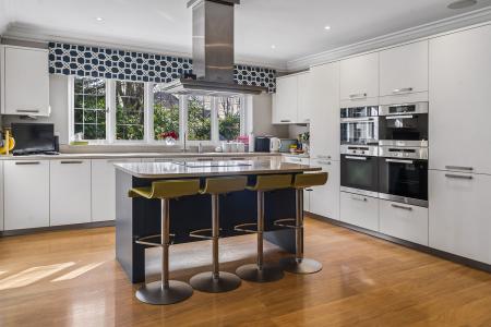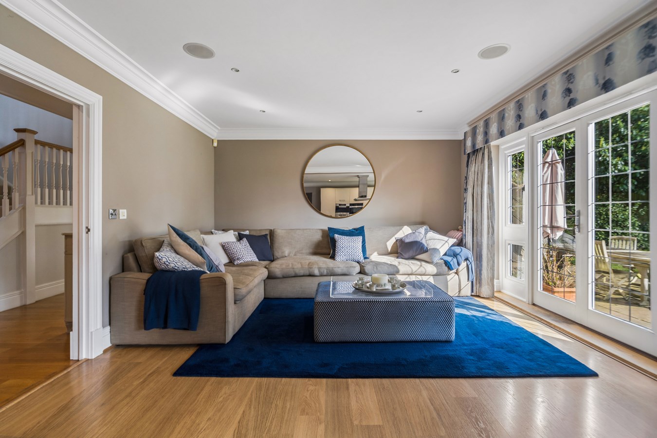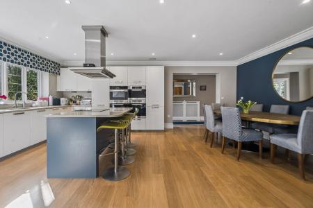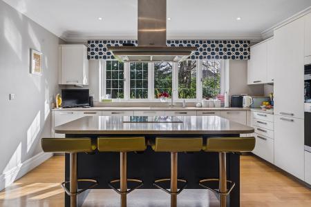 At the heart of the home is the impressive kitchen / breakfast / dining room (21’2 x 14’6 / 6.46m x 4.41m). This contemporary space is fitted with a fully integrated kitchen with high-specification appliances such as dishwasher, fridge freezer, double oven, steam oven and microwave, extensive cabinetry and a central island, seamlessly flowing into the dining and breakfast areas. An adjoining snug (14’0 x 13’3 / 4.26m x 4.03m) offers a cosy additional reception space, ideal as a family room or informal lounge. French doors provide access to the garden, enhancing the indoor-outdoor living experience.