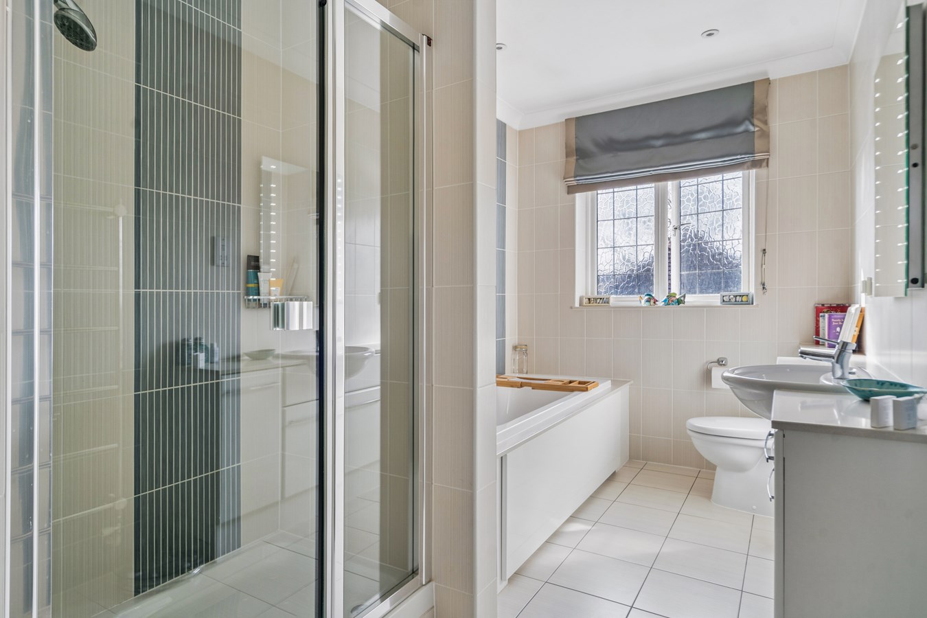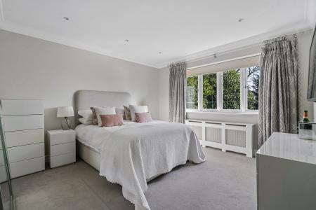 The first floor offers well-balanced bedroom accommodation arranged around a central landing. The impressive principal bedroom (21’4 x 14’4 / 6.50m x 4.38m) enjoys generous proportions and is served by a beautifully appointed en-suite bathroom. Bedroom two (17’5 x 12’2 / 5.31m x 3.72m) is a spacious double room with access to a stylish en-suite bathroom, while bedroom three (13’5 x 10’0 / 4.08m x 3.05m) provides further comfortable accommodation, also with ensuite shower room. Two additional double bedrooms include bedroom four (15’1 x 11’6 / 4.61m x 3.51m) and bedroom five (14’4 x 10’0 / 4.38m x 3.06m). These rooms are served by a contemporary family bathroom.