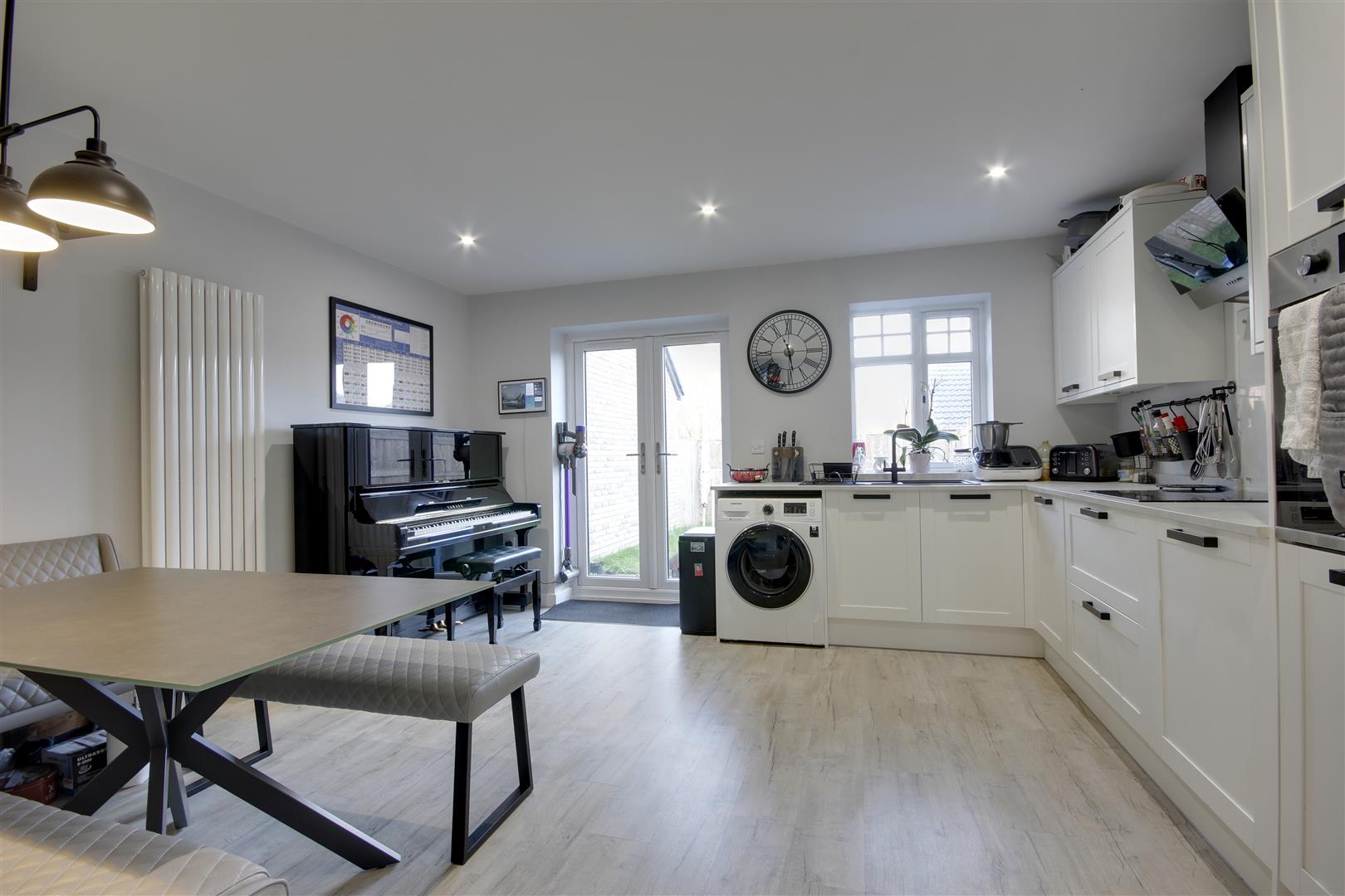 Dining Kitchen - 4.34m x 4.04m approx (14'3" x 13'3" approx) - Having a range of base and wall units with laminate worktops, one and a half bowl sink and drainer with mixer tap, oven, induction hob with feature filter above, integrated fridge/freezer and dishwasher. There is plumbing for a washing machine, ample space for a dining table and chairs plus French doors leading out to the rear garden.