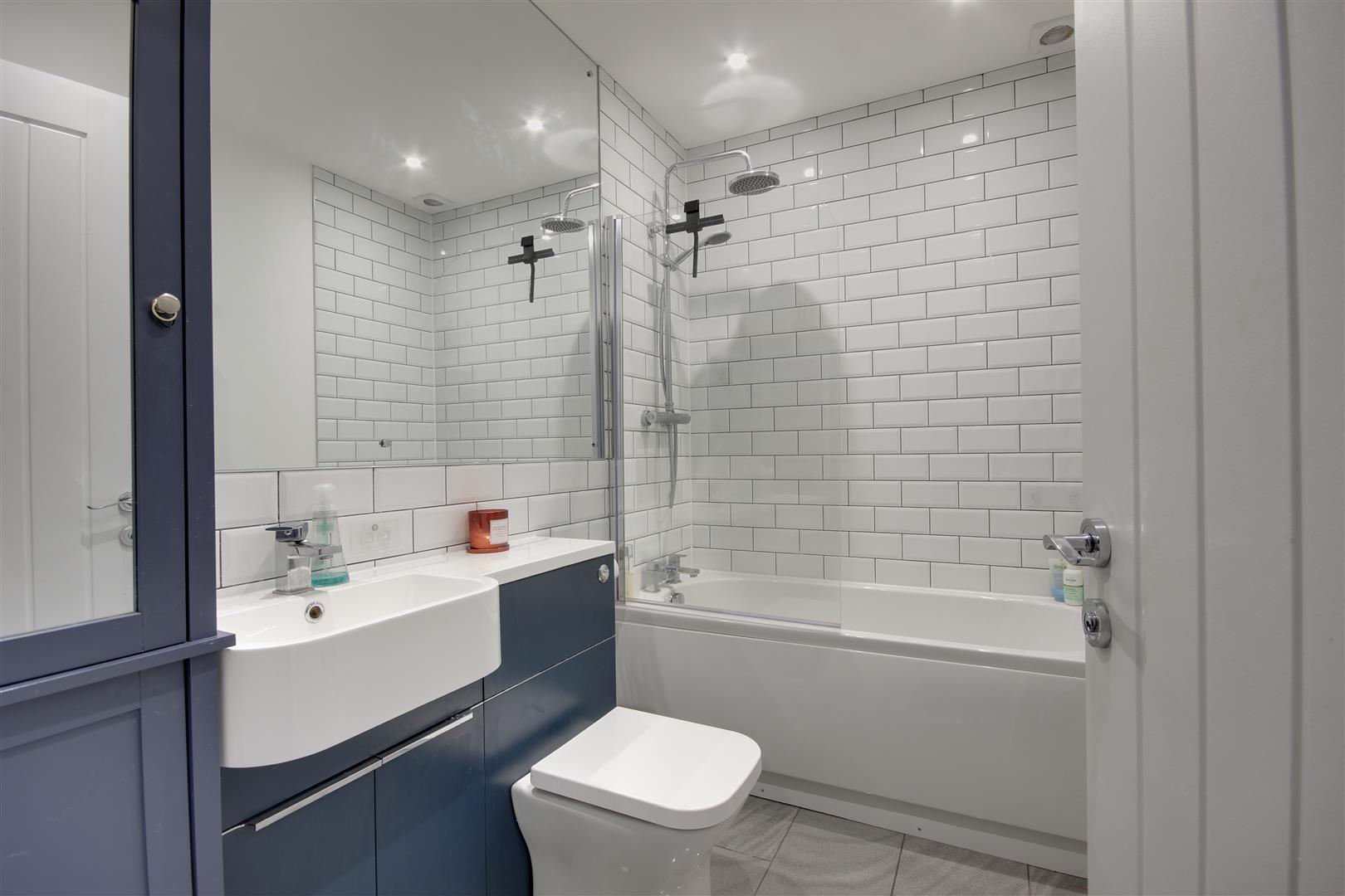 Bathroom - With suite comprising a bath with shower over and screen, vanity unit with wash hand basin and low flush W.C. Heated towel rail, tiled floor.