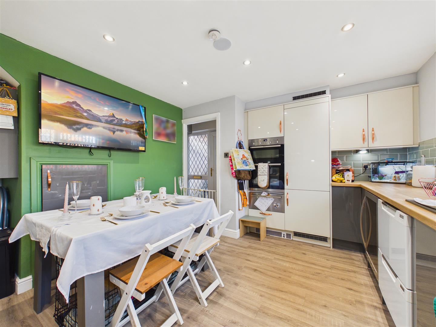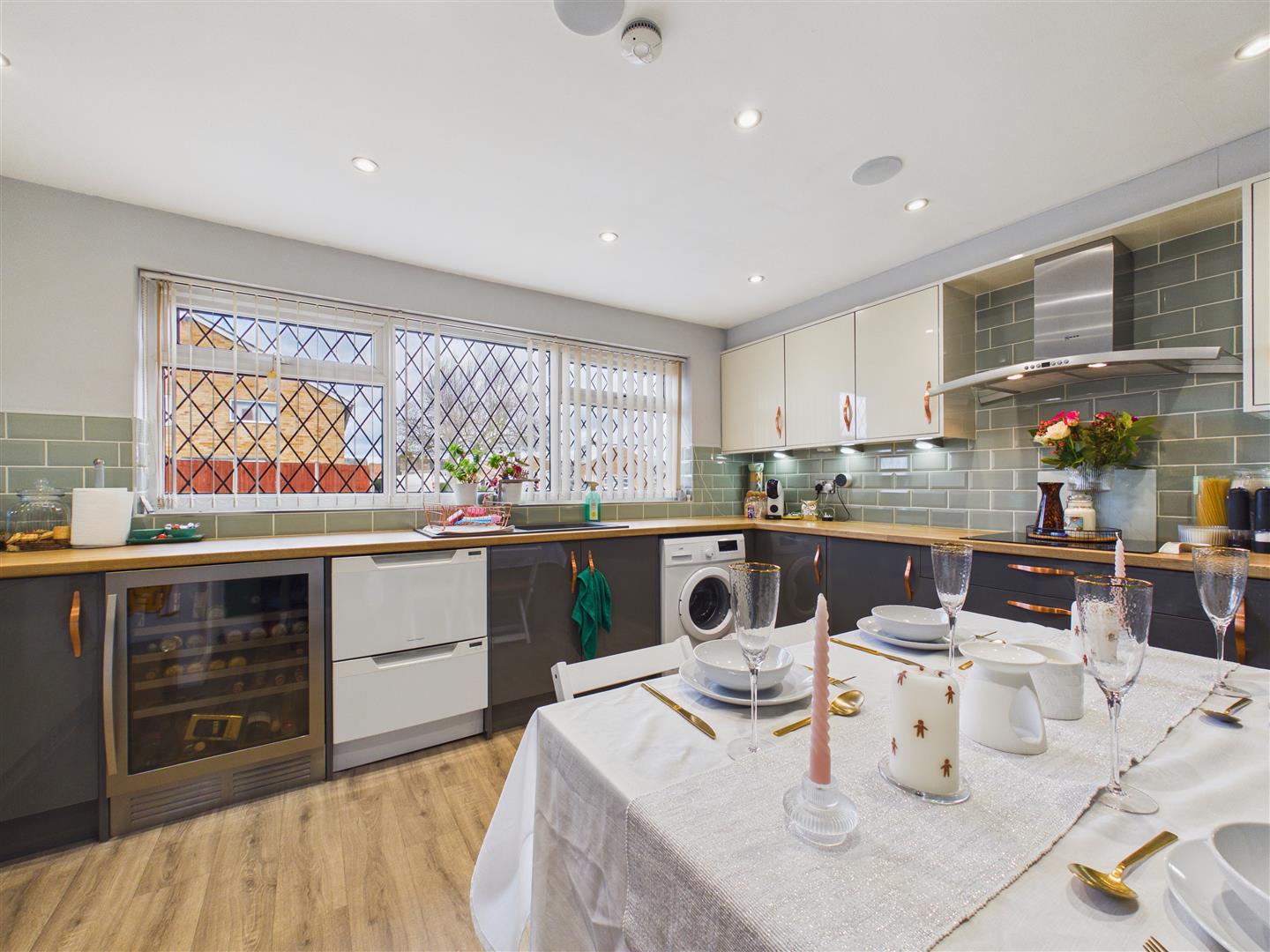 Kitchen/Diner - Of a contemporary style with fitted units and worksurfaces throughout, the kitchen benefits from integrated appliances including double oven with warming drawer underneath, fridge-freezer and plumbing with space for a dishwasher, wine cooler and washing machine. There is a sink & drainer beneath a window to the front of the property, and a four-ring induction hob sits beneath a filter hood and chimney with a tiled splashback extending the surround of the worksurfaces. There is comfortable space for a small dining table, with additional understairs storage access available.