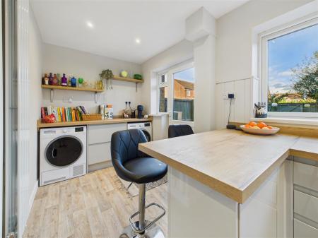 Kitchen/Utility - Stylish and open kitchen/utility space with high-gloss fitted units and wood-effect worksurfaces. The kitchen area presents a one-and-a-half sink & drainer beneath window to rear, an integrated double oven and dishwasher, and a four-ring induction hob with filter unit above. A breakfast peninsula provides additional worksurface space and a partition between the kitchen and the utility areas. There is a door to an understairs storage cupboard, and the utility area comprises a fitted worksurface to the wall, plumbing for a washing machine, room for a dryer and a door and window to the rear garden.
