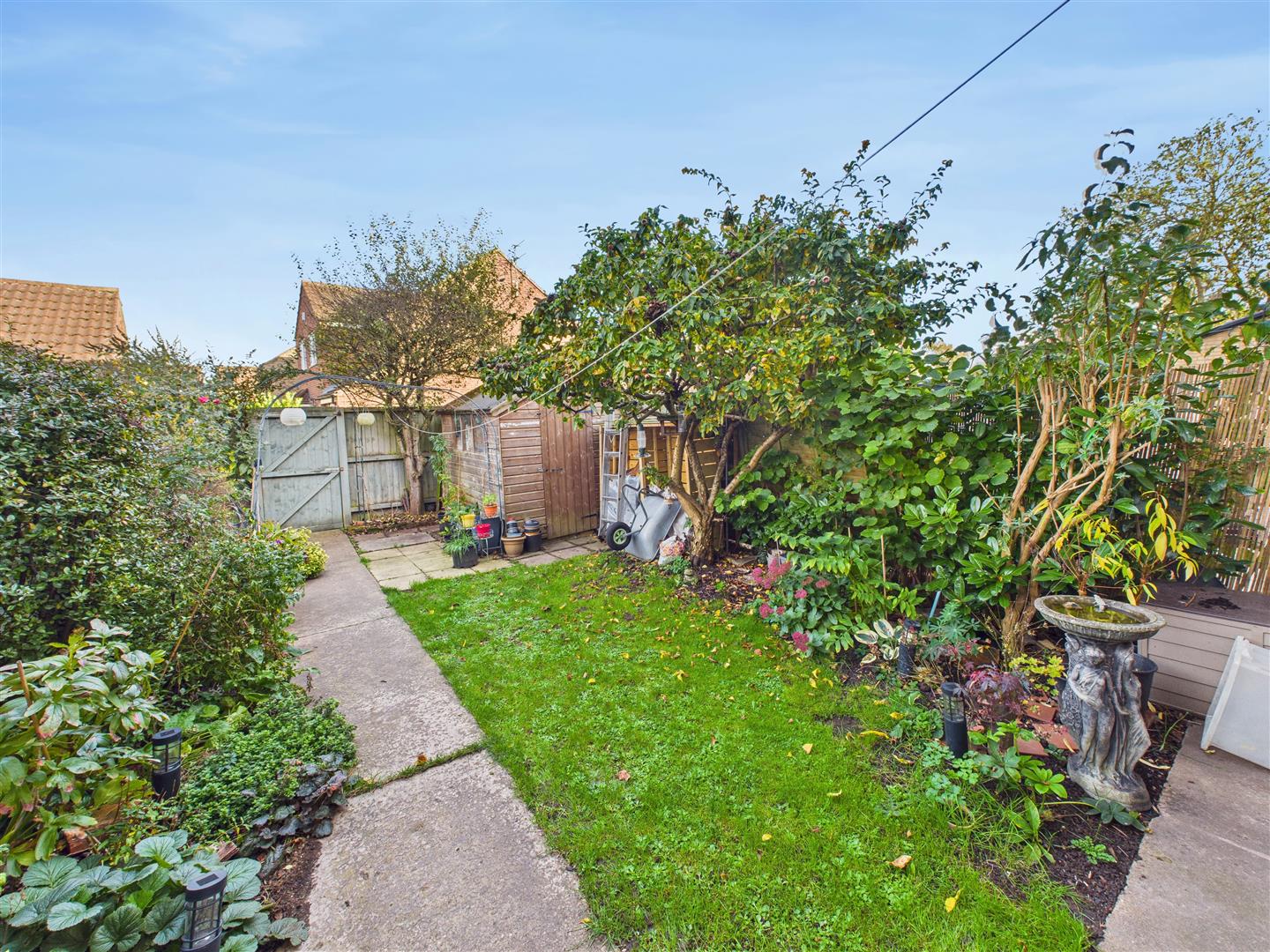 Outside, the property includes a private lawned garden at the front, shielded by hedging and a garage situated within a separate garage block. The rear garden also features a lawn with mature shrubs and has a useful rear access gate, completing this attractive and easily managed home.