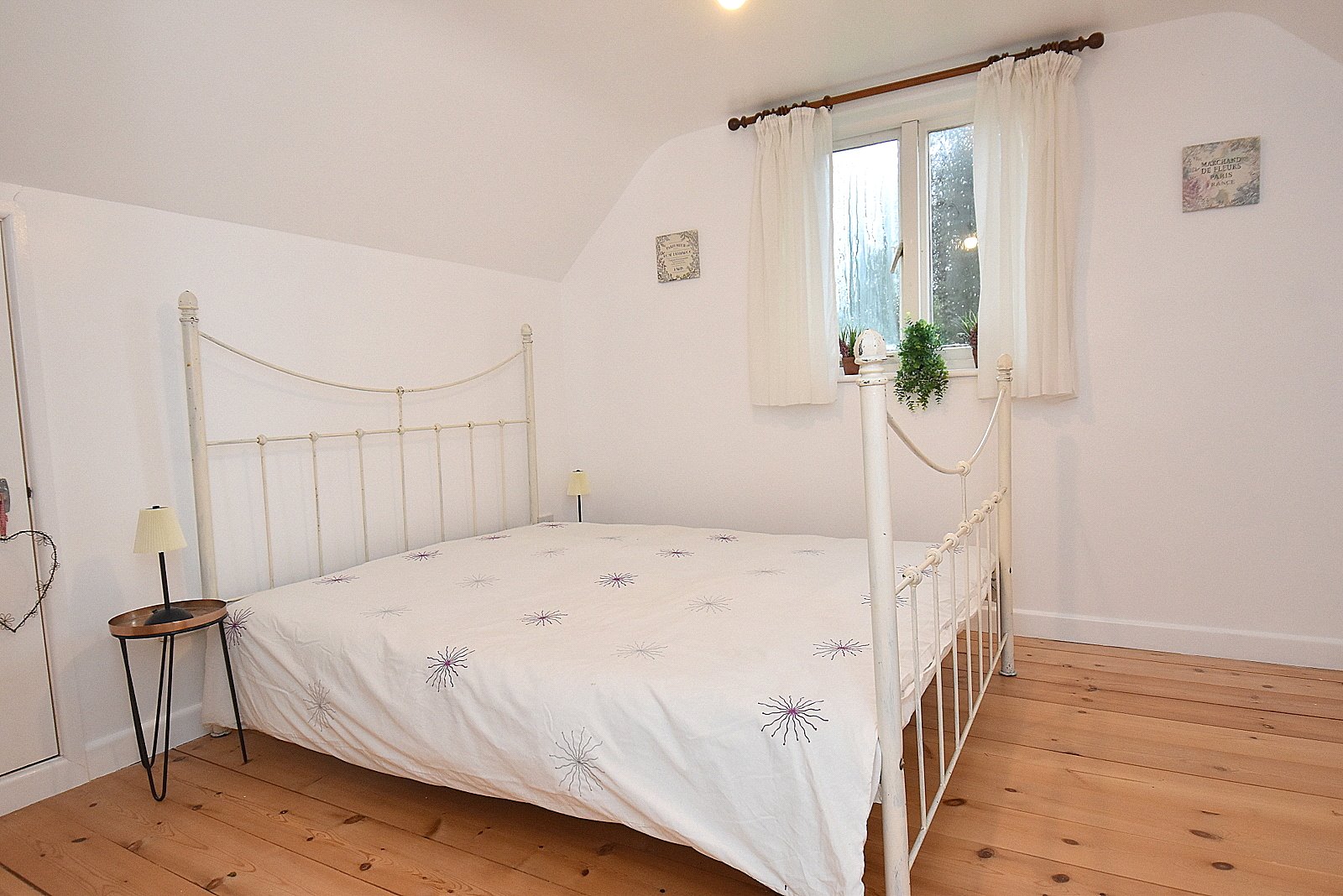 BEDROOM 1: 12’6” (max) x 11’ (narrowing to 8’5” to the chimney breast) A light and airy room featuring the chimney breast of the inglenook, sash window overlooking the garden, church and countryside beyond. Fitted double wardrobe with hanging rail and shelving, Dimplex Quantum storage heater and exposed painted floorboards.