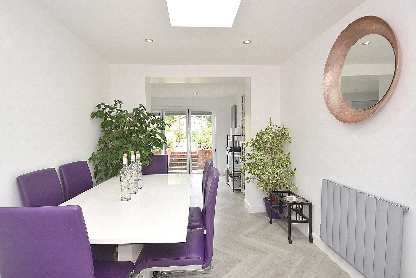 SITTING ROOM: 21’1” x 12’3” (narrowing to 8’9”) A light and airy room with bi-folding doors leading out to the rear garden. Long alcove providing a focal point for a wall mounted television, vertical radiator, skylight window, radiator, smooth plastered ceiling and door to: