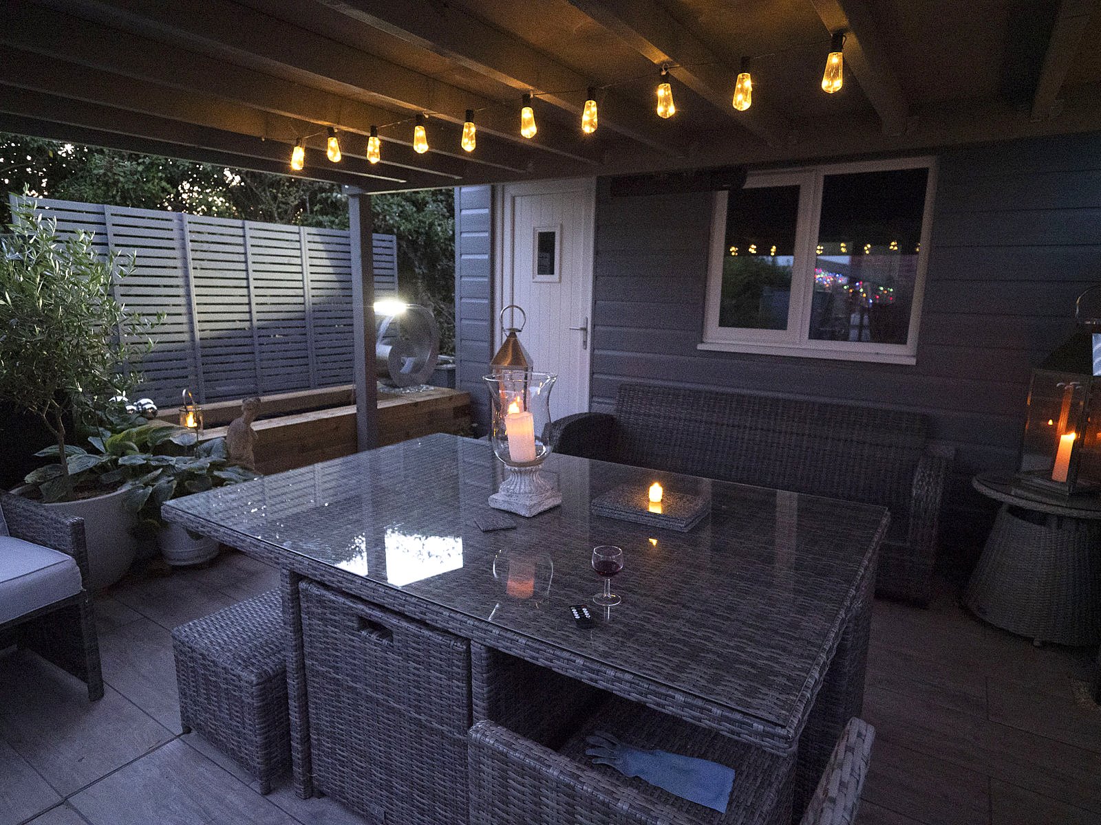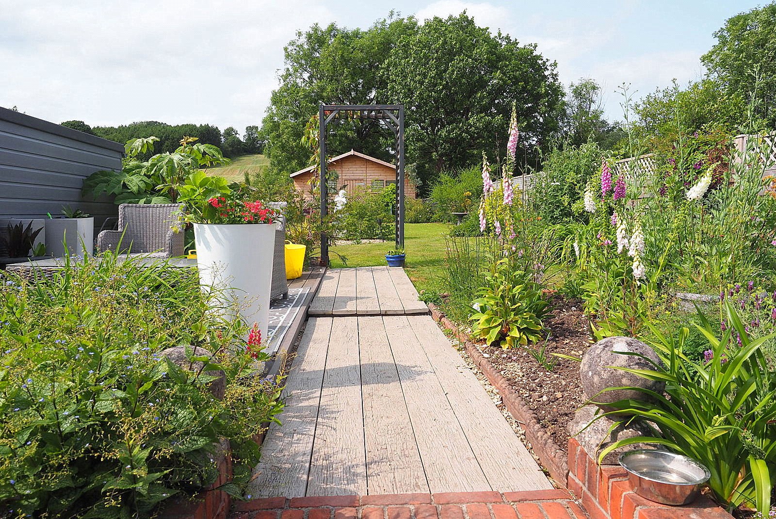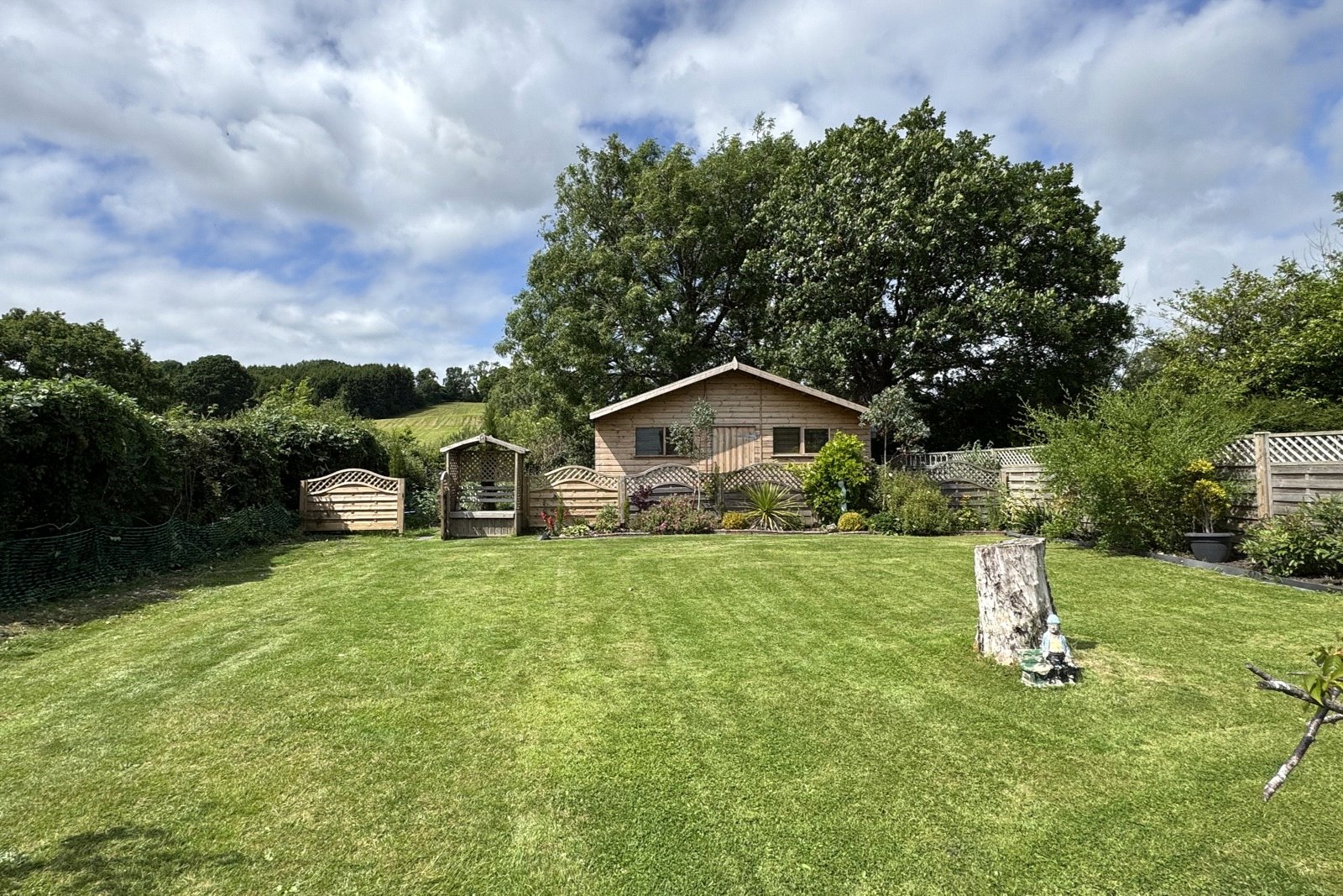 Beyond the seating area, a large expanse of lawn leads to a wildlife corner and substantial timber cabin (19`2” x 16`), fully lined and equipped with light and power, perfect for use as a home office, gym, or creative space.