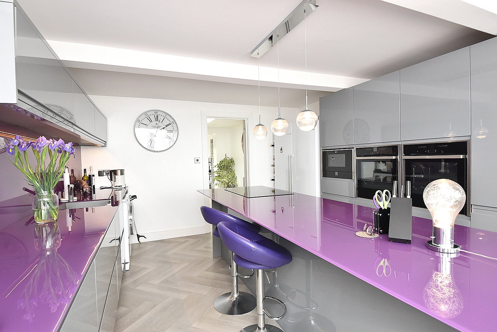The heart of this home is undoubtedly the kitchen, a striking space featuring an extensive range of sleek wall and base units complemented by a stunning glass work surface. The kitchen is fully equipped with premium appliances, including two eye-level Neff "slide & hide" ovens, microwave, five ring induction hob, and a large central island, making it the perfect area to create delightful meals.