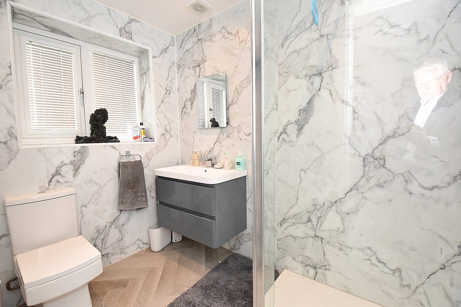 EN-SUITE SHOWER ROOM: A modern stylish suite with large shower cubicle, wall mounted wash basin unit, low level WC, vertical radiator with towel rail, smooth plastered ceiling with downlighters and double glazed window.