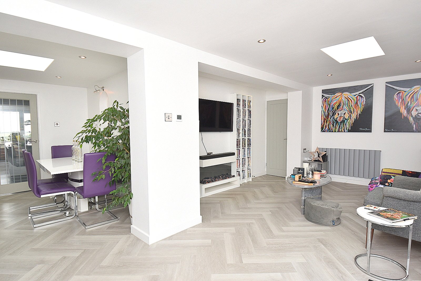 DINING ROOM: 10’10” x 8’4” Radiator, skylight window, arched alcove, picture light point, smooth plastered ceiling with downlighters and wide opening to: