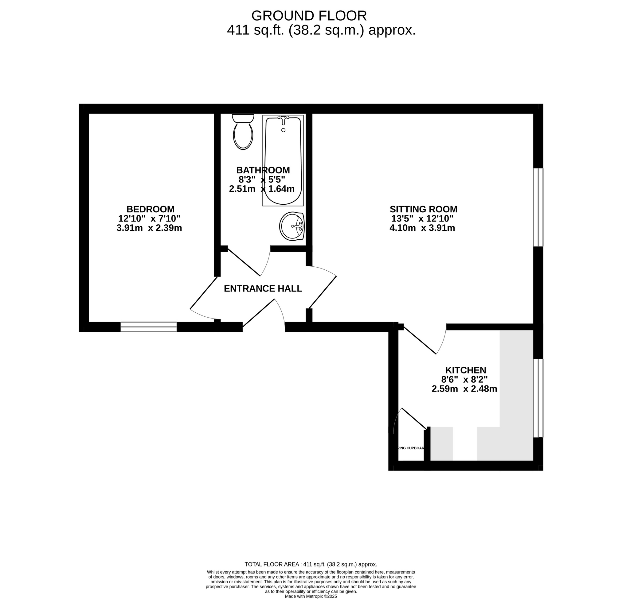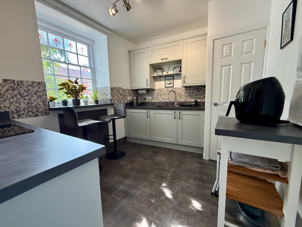 - Bright sitting room with front-facing window and direct access into a stylish, modern kitchen fitted with integrated appliances