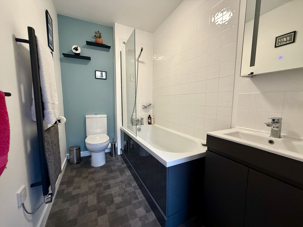 - Modern bathroom with white suite including a panelled bath with shower over, vanity unit with inset basin, WC, and heated towel rail