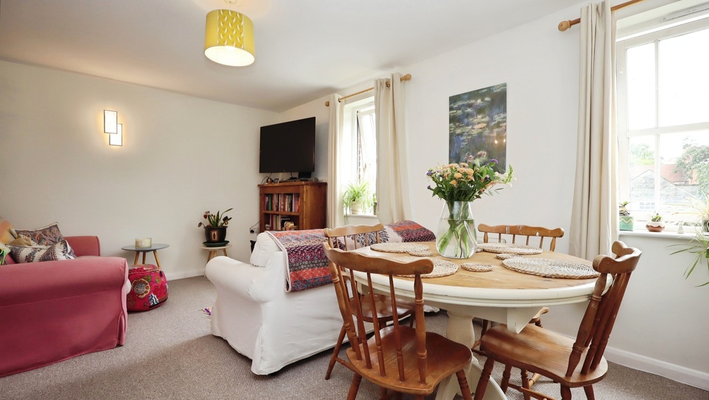 - To the left is a freshly carpeted, open plan kitchen, living and dining area which is wonderfully light and airy and benefits from an outlook towards Glastonbury Tor.